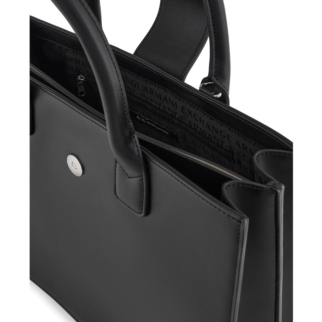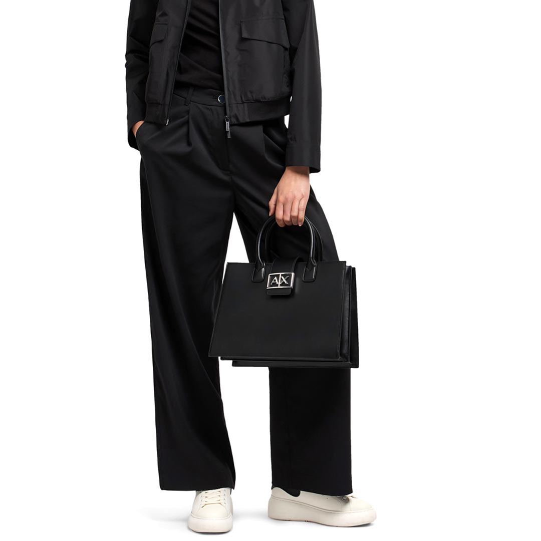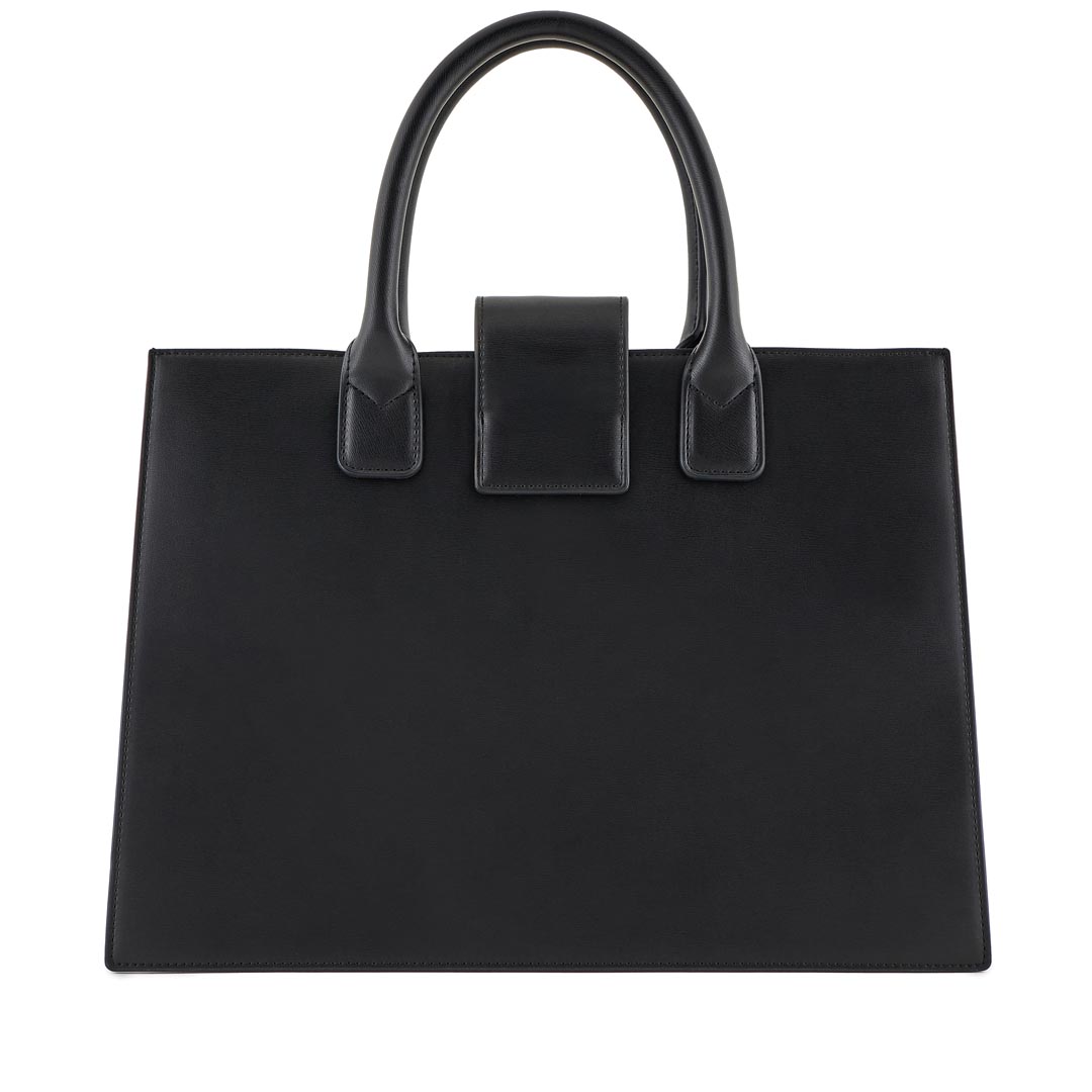 Borsa a mano dalla forma a trapezio, elegante e sofisticata. Il design strutturato dona un aspetto moderno e versatile, perfetto per ogni occasione. La tracolla removibile permette di trasformarla facilmente in una borsa a mano o a tracolla, offrendo praticità e stile. La chiusura ad incastro assicura sicurezza e facilità d'uso, mentre la decorazione con logo aggiunge un tocco distintivo e raffinato. Un accessorio chic e funzionale, ideale per completare qualsiasi outfit con eleganza. Borsa a mano in ecopelle Dettaglio decorativo con logo Chiusura ad incastro Due manici Tasca interna Tracolla removibile Dimensioni: 33,5 x 14 x 23 cm