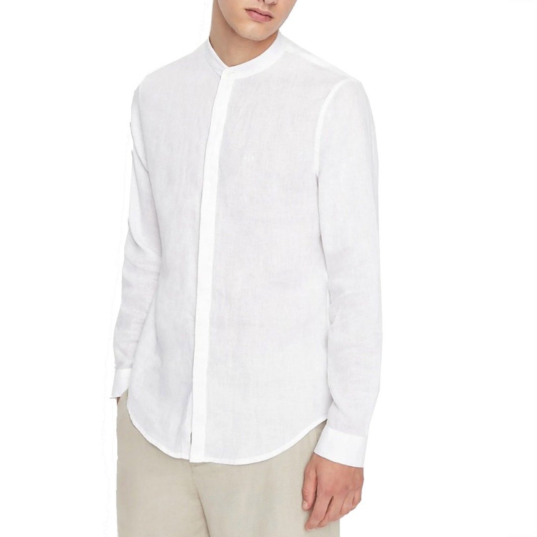 Camicia da uomo firmarta Armani Exchange realizzata in lino. Colletto alla coreana, chiusura anteriore con bottoni, maniche lunghe e orlo curvo per uno stile sofisticato e sempre attuale. Tinta unita.