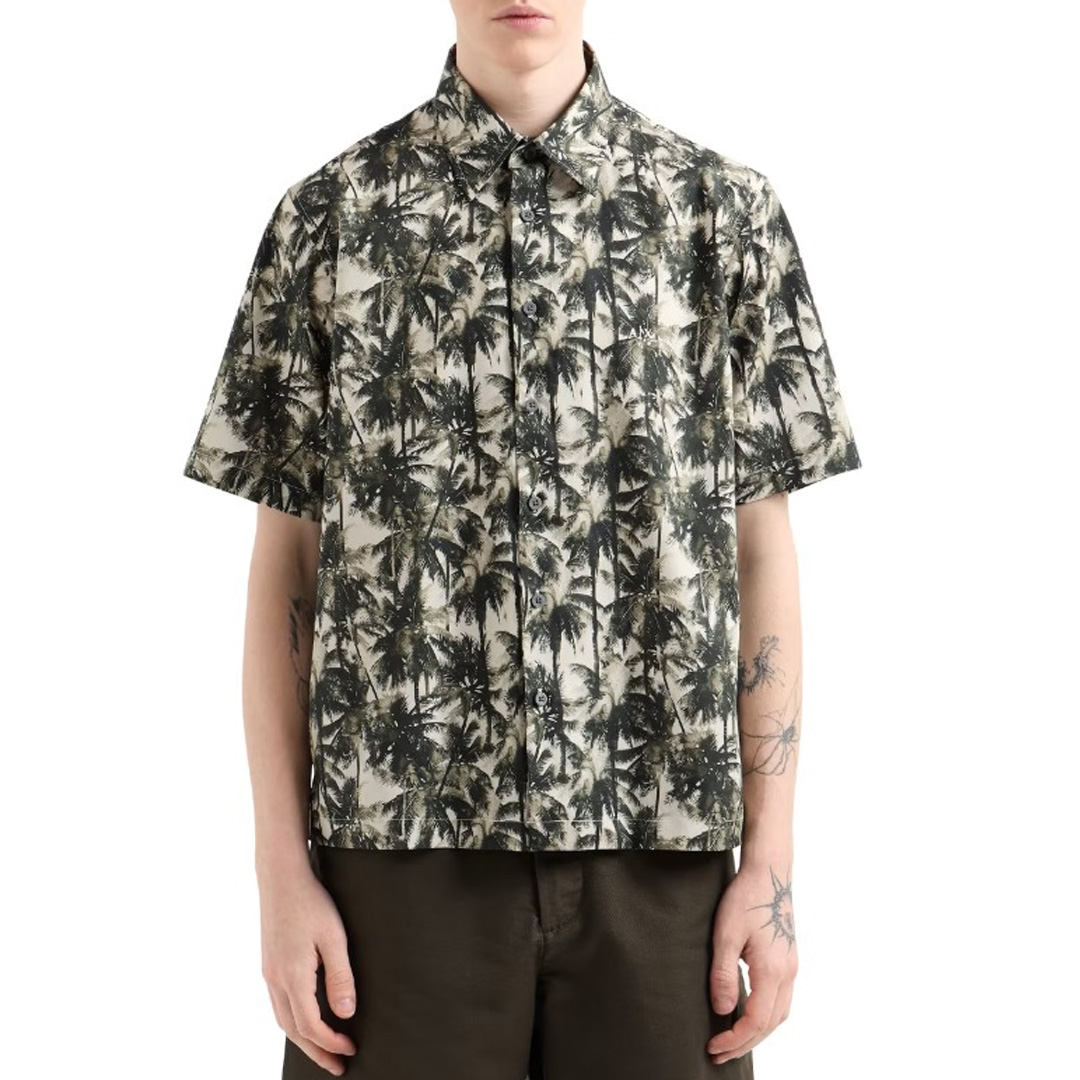 Camicia a maniche corte con fantasia all over. Prodotto realizzato da Armani Exchange per la stagione Primavera/Estate 2025. Chiusura sulla parte frontale a bottoni bianchi. Collo a punta. Tessuto in cotone.