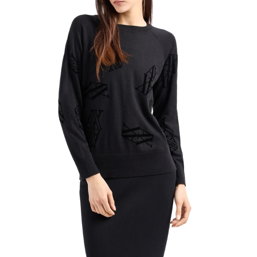 Maglione realizzato in cotone, viscosa e seta caratterizzata dalla presenza del logo monogram in versione floccata tono su tono. Il modello ha scollo tondo e profili a costine. Questo capo fa parte della selezione ASV perché il tessuto è realizzato con materiale sostenibile o riciclato certificato: un modello che unisce lo stile A|X con l'impegno del brand verso una sempre più alta attenzione. In maglia Floccato Brand logo Maglia leggera Tinta unita Collo a V
