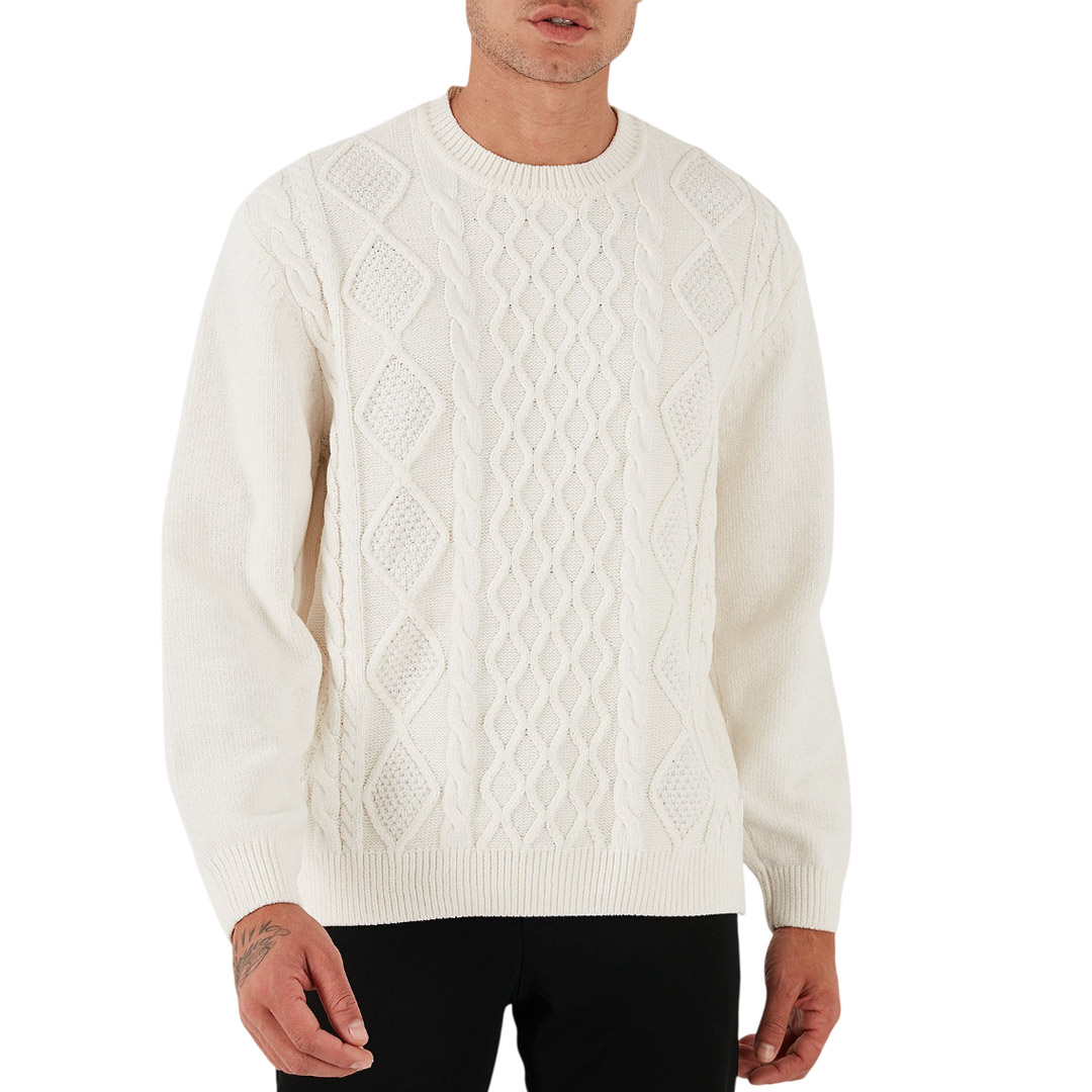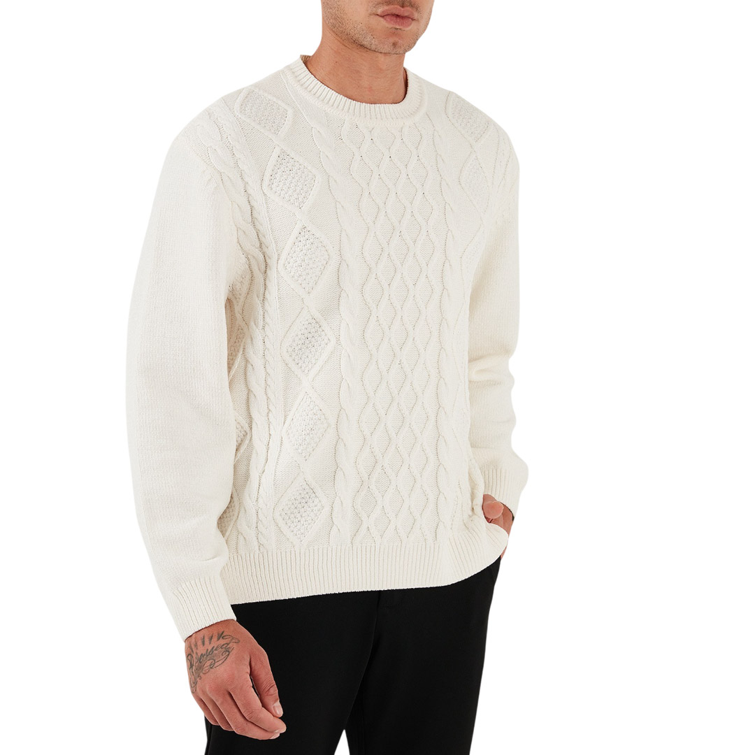 Maglione girocollo realizzato con una raffinata lavorazione a intreccio, perfetta per un look sofisticato e avvolgente. Il filato morbido e la texture tridimensionale lo rendono ideale per le giornate più fresche, aggiungendo un tocco di eleganza e calore al tuo outfit.