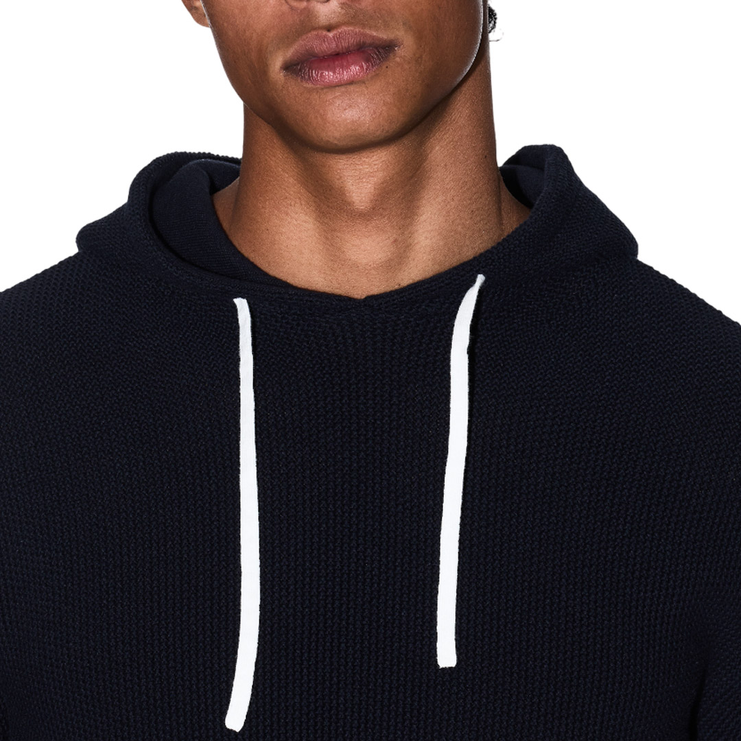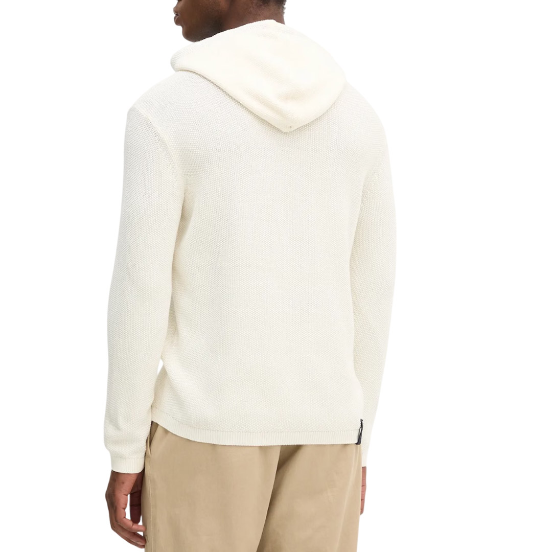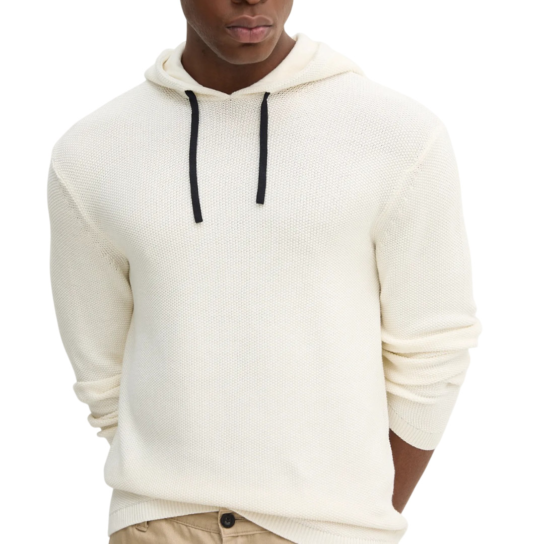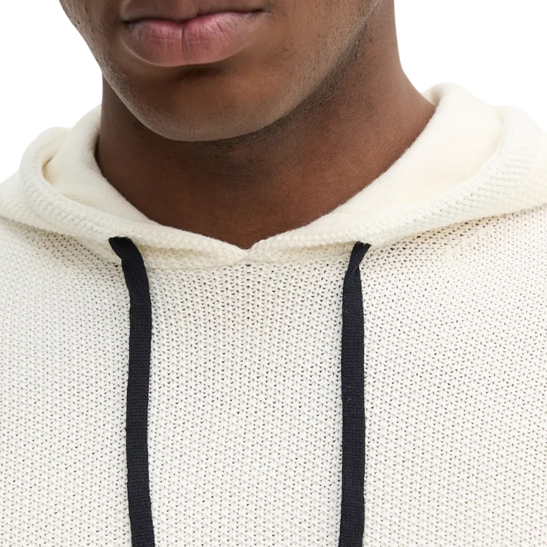 Maglione con cappuccio in cotone lavorato a maglia con punto riso, che gli conferisce una texture tridimensionale e un fascino super contemporaneo. Questo capo ibrido tra un maglione e una felpa è ideale per chi cerca comfort e stile senza compromessi. Il cappuccio con coulisse a contrasto aggiunge un dettaglio urbano e funzionale, mentre la silhouette rilassata lo rende perfetto per ogni momento della giornata.