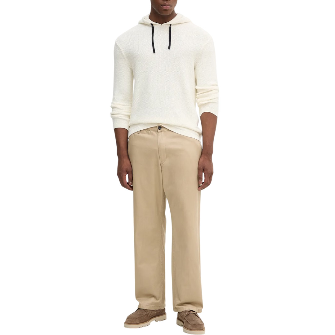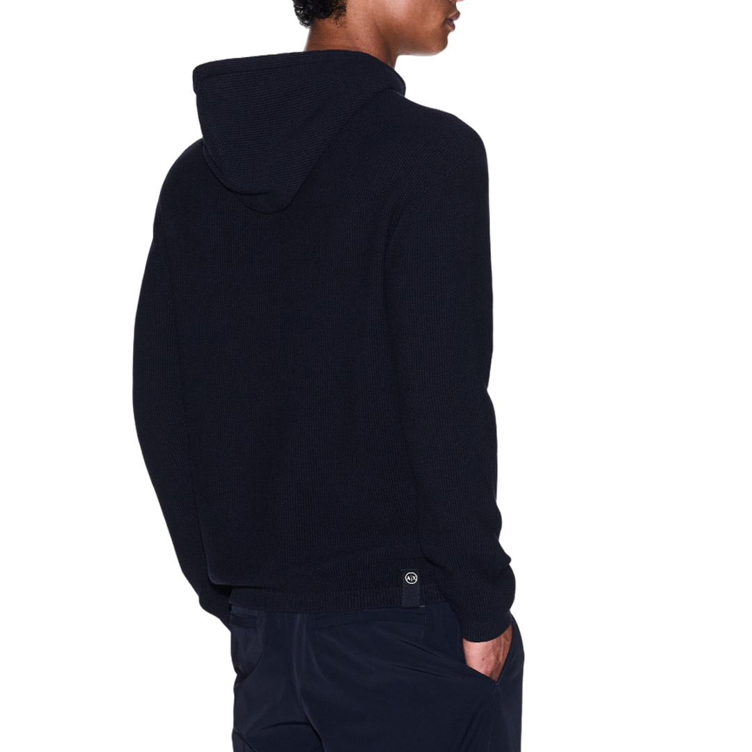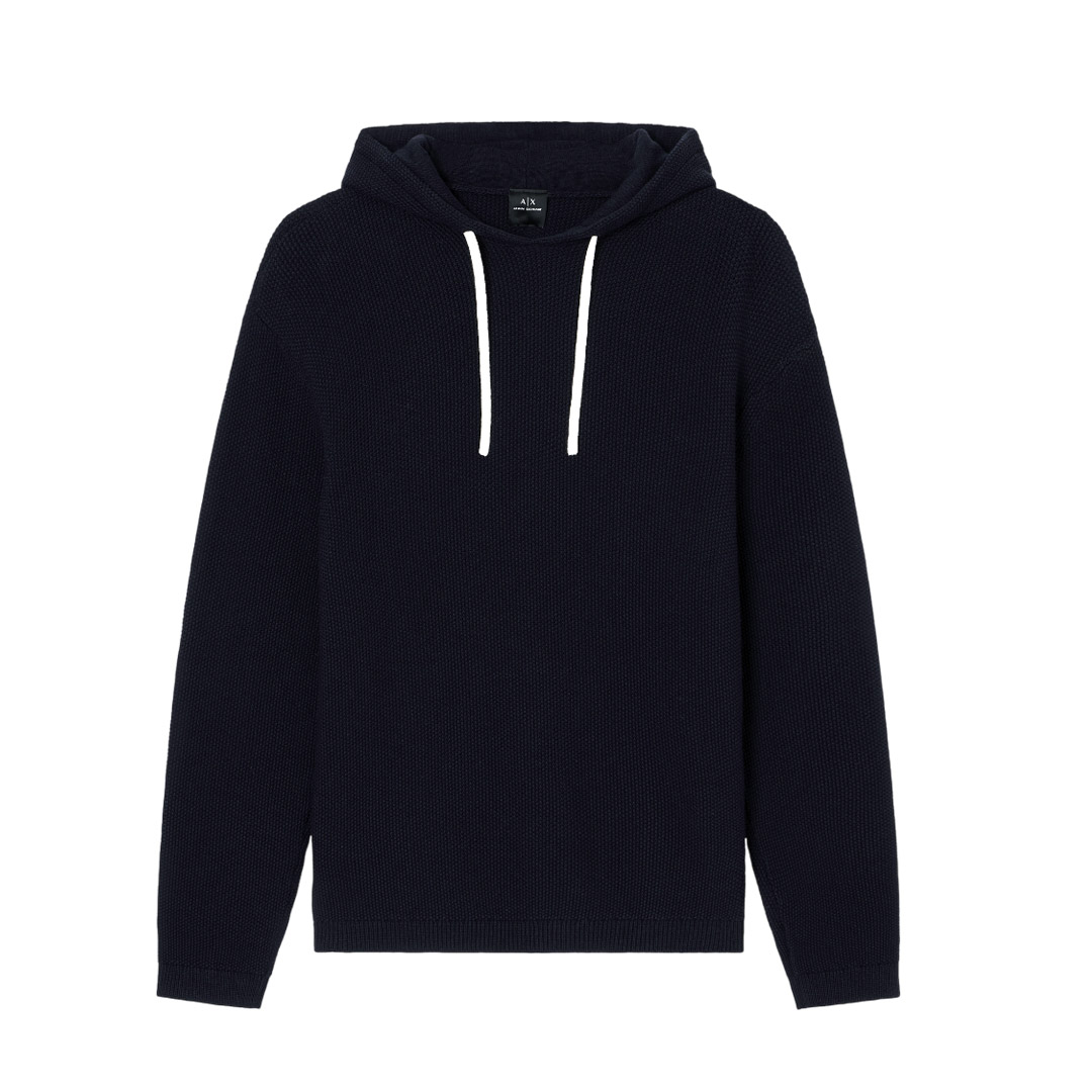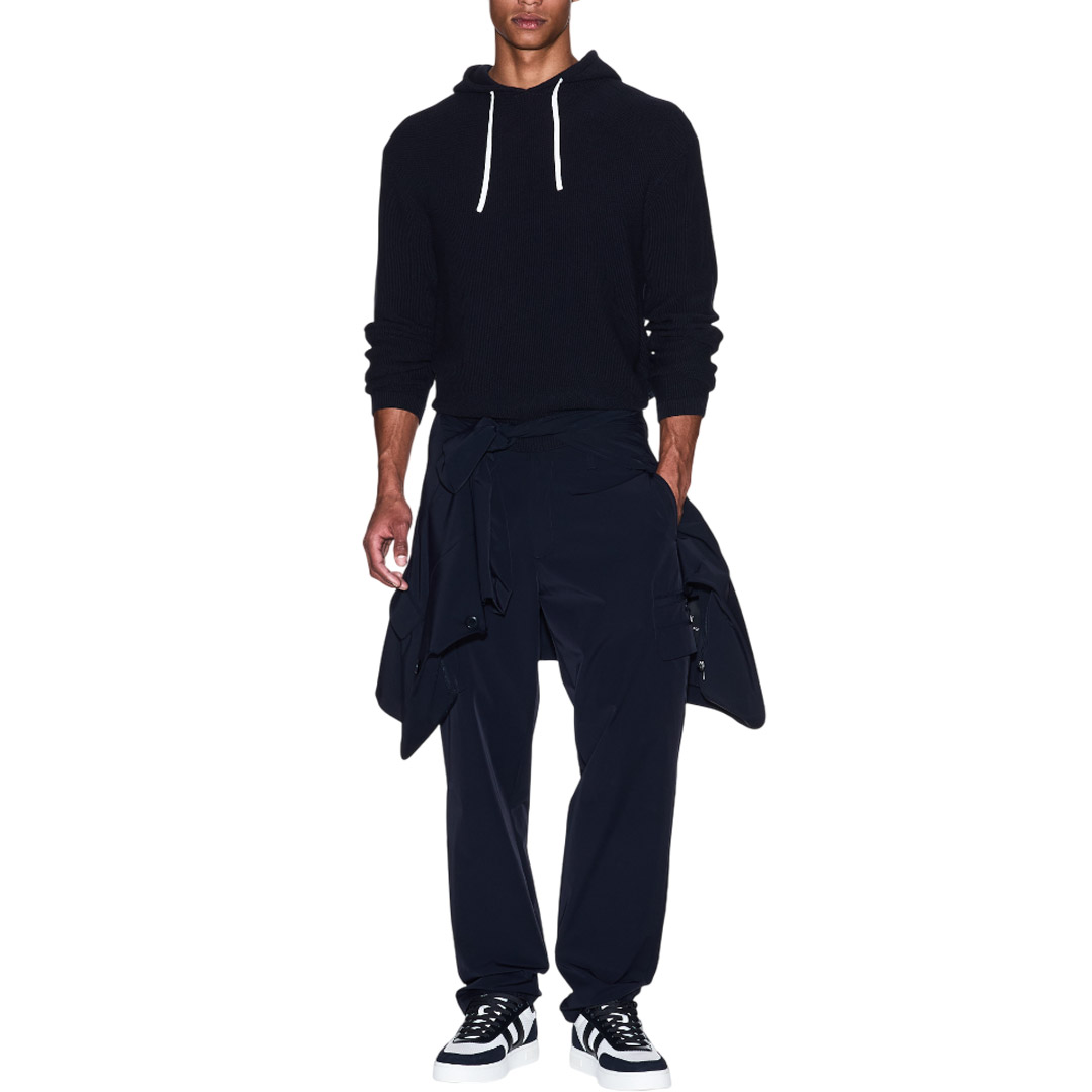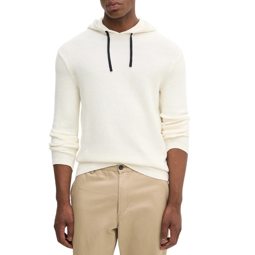 Maglione con cappuccio in cotone lavorato a maglia con punto riso, che gli conferisce una texture tridimensionale e un fascino super contemporaneo. Questo capo ibrido tra un maglione e una felpa è ideale per chi cerca comfort e stile senza compromessi. Il cappuccio con coulisse a contrasto aggiunge un dettaglio urbano e funzionale, mentre la silhouette rilassata lo rende perfetto per ogni momento della giornata.