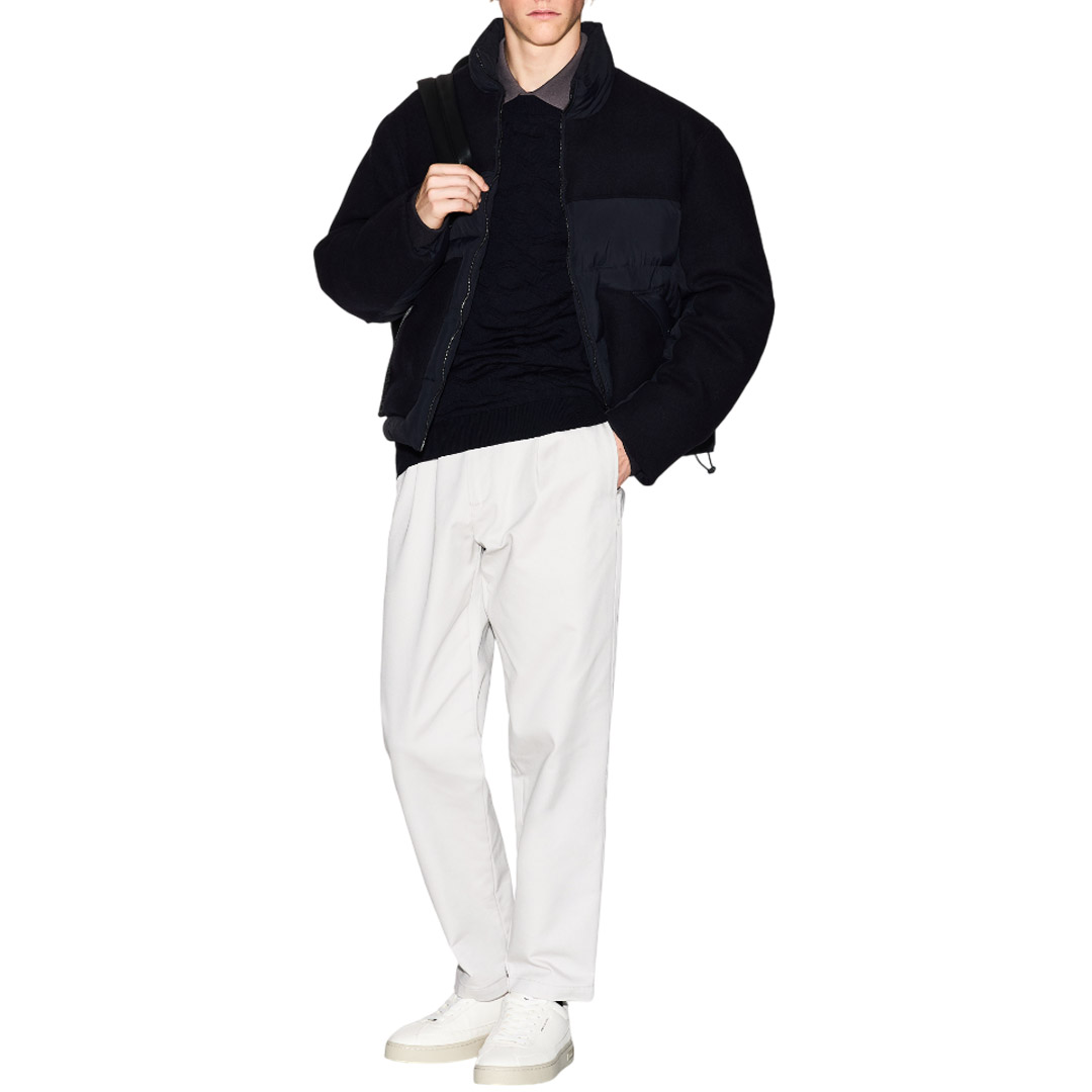 Tessuto: 50% acrilica, 50% lana vergine; dettagli in maglia: 46% acrilica, 43% lana vergine, 9% poliammide, 2% elastan