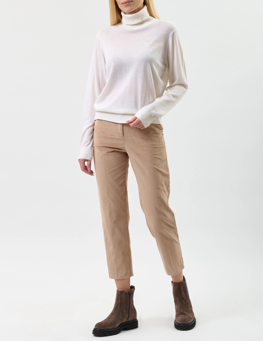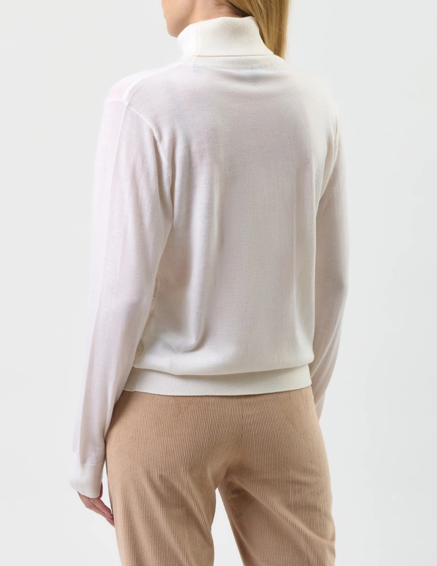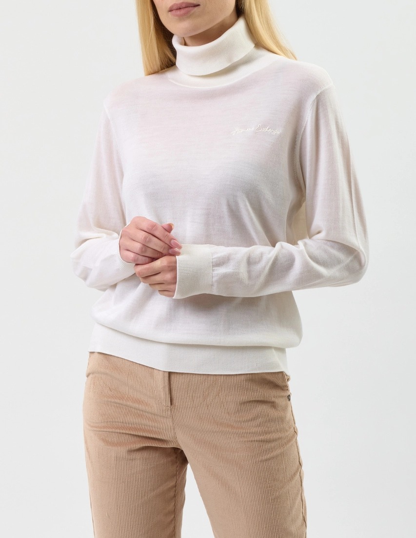 Maglione a collo alto realizzato in filato merino. La sua silhouette essenziale e la texture lussuosa lo rendono incredibilmente versatile: indossalo da solo per un look minimal chic che non passa inosservato, o come base sofisticata per audaci sovrapposizioni con blazer oversize o giacche di pelle. Il discreto logo ricamato tono su tono sul petto aggiunge un tocco iconico senza eccessi.
