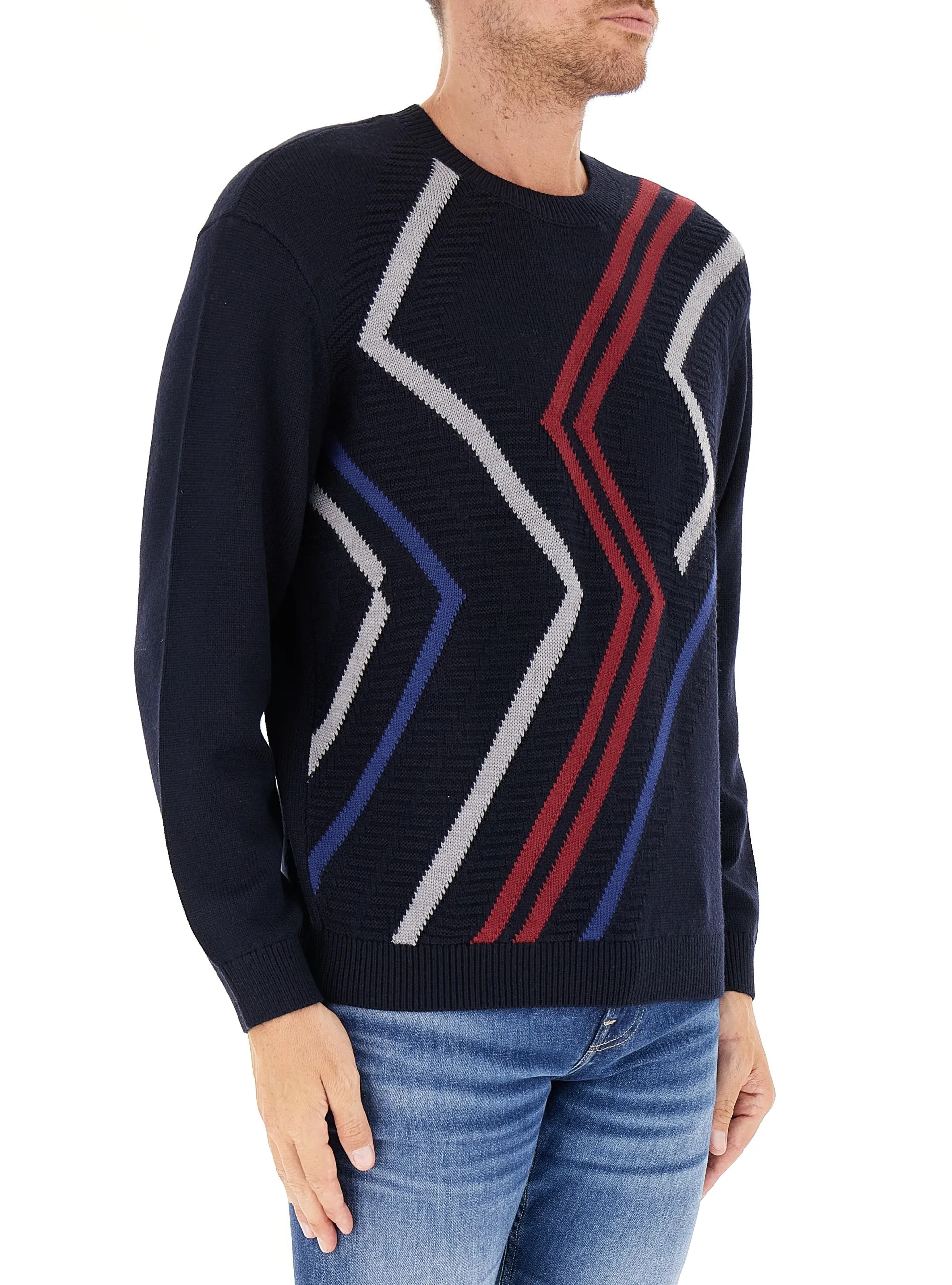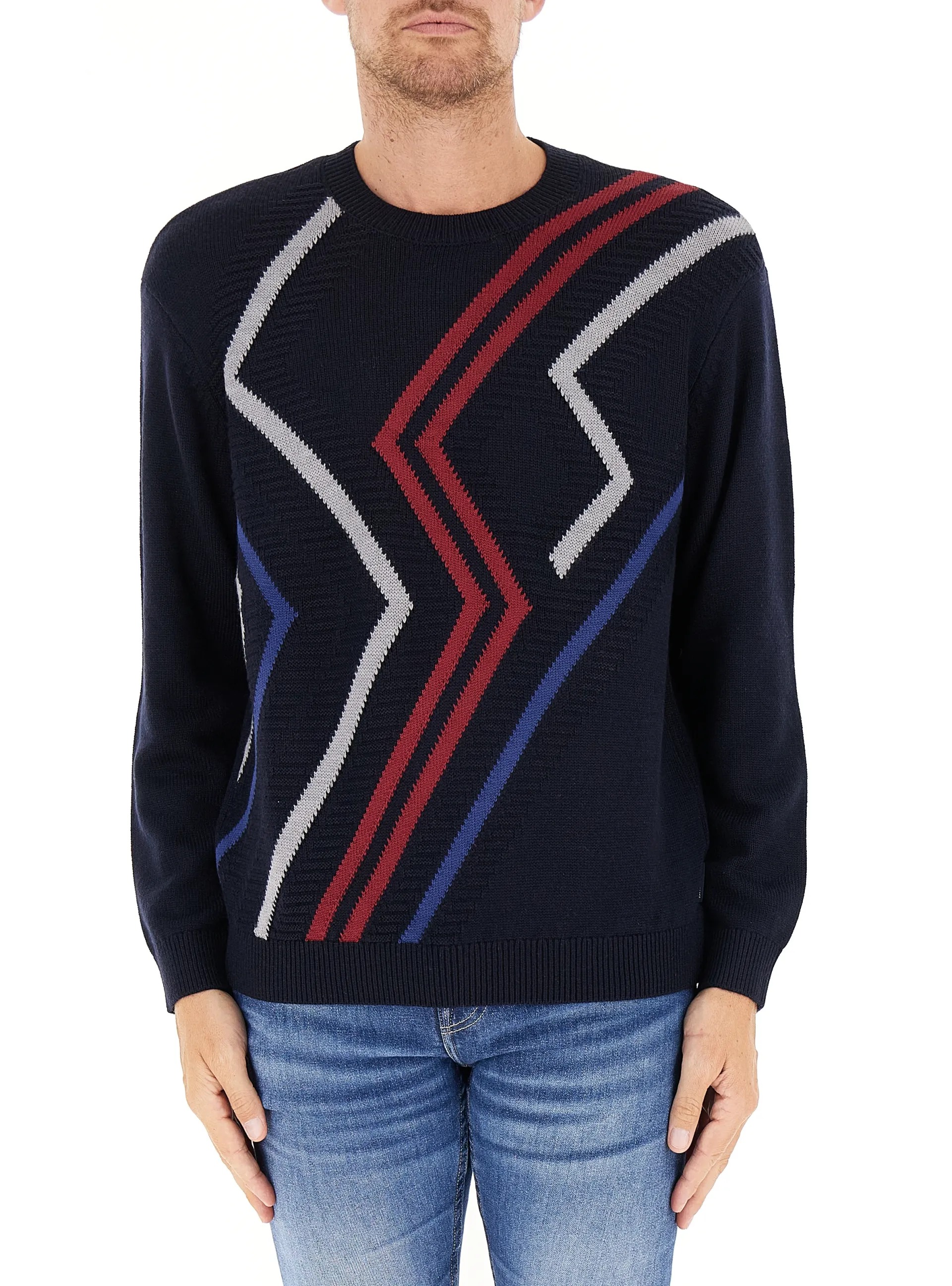 Maglione girocollo realizzato in un filato morbido e confortevole, scelto per la sua capacità di offrire calore e una piacevole sensazione sulla pelle. La sua texture, compatta ma flessibile, garantisce una vestibilità versatile e una silhouette definita. La lavorazione a intarsio geometrico aggiunge un elemento visivo originale.