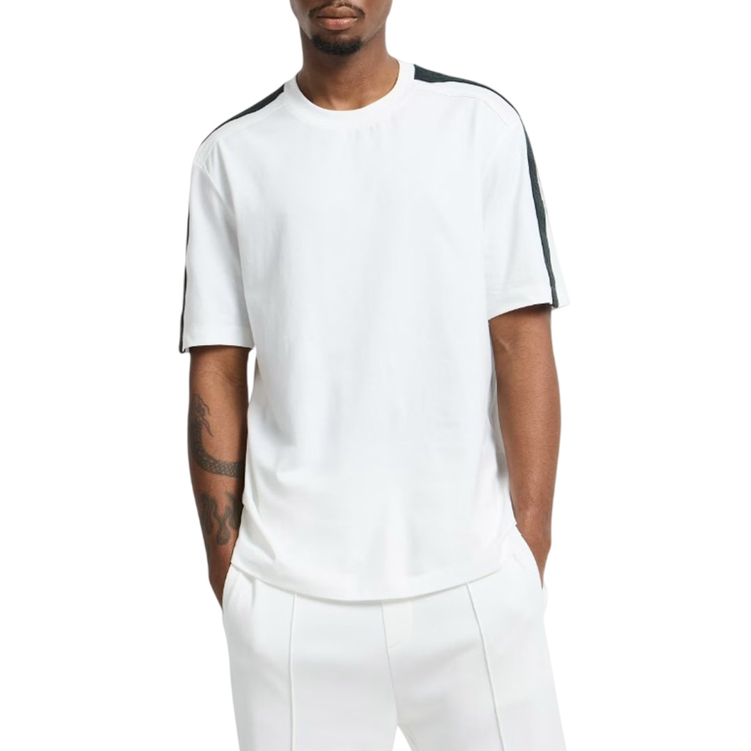 Questa t-shirt regular fit in cotone è un capo essenziale per un look casual e moderno. Realizzata in morbido cotone, garantisce comfort e traspirabilità per tutto il giorno. La banda a contrasto con logo sulle spalle aggiunge un tocco distintivo e sportivo, rendendola perfetta per chi cerca uno stile dinamico. Il classico scollo tondo completa il design, mentre la vestibilità regular fit offre libertà di movimento. Ideale per essere abbinata a jeans o pantaloni casual, per un outfit semplice ma stiloso. T-shirt regular fit In cotone Bande con logo sulle spalle Maniche corte
