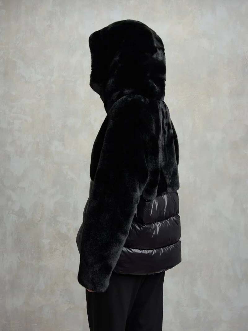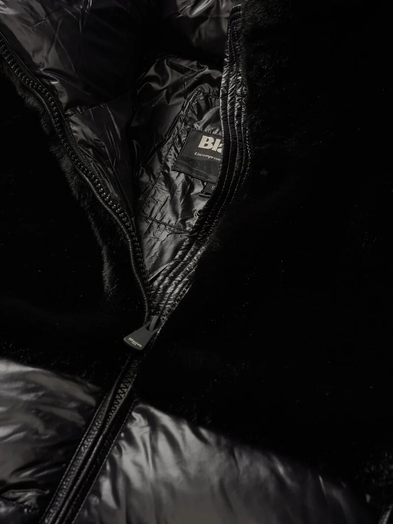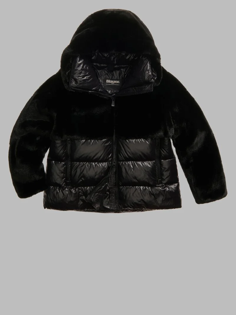 Giubbetto in ecopelliccia nella parte superiore e in nylon lucido nella parte inferiore. Caldo cappuccio ed impuntura sotto a righe orizzontali; capo pensato per proteggere dagli inverni più rigidi senza rinunciare allo stile. • Cappuccio fisso in pelliccia ecologia con coulisse • Realizzato in nylon ed eco pelliccia • Foderato in nylon lucido in tono • Imbottito ovatta Sorona® Aura • Chiusura con zip • Tasche con zip e copri cursore • Fondo manica doppio con elastico interno • Coulisse sul fondo • Tasche interne con velcro