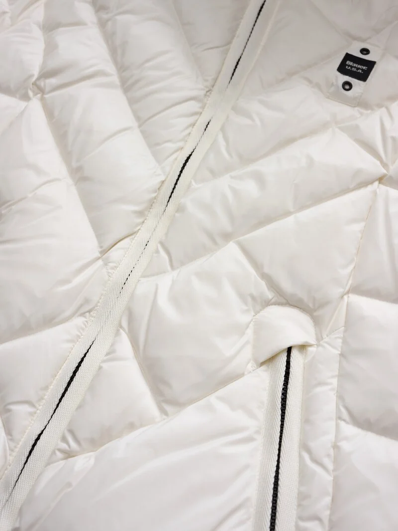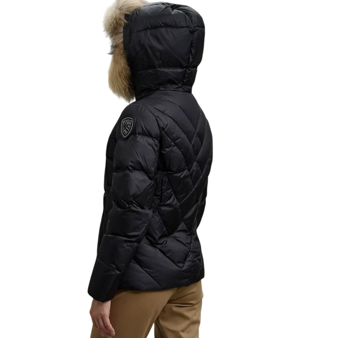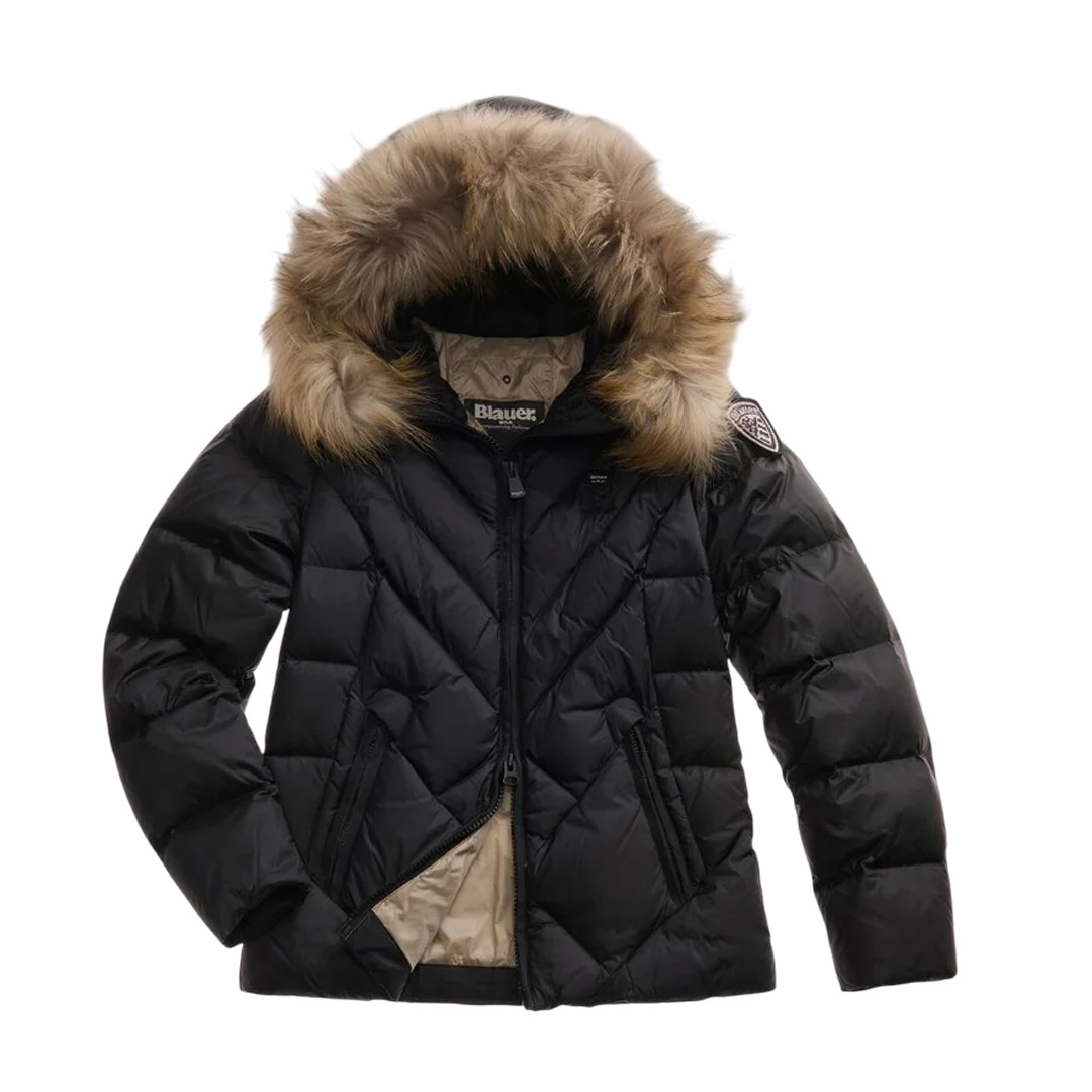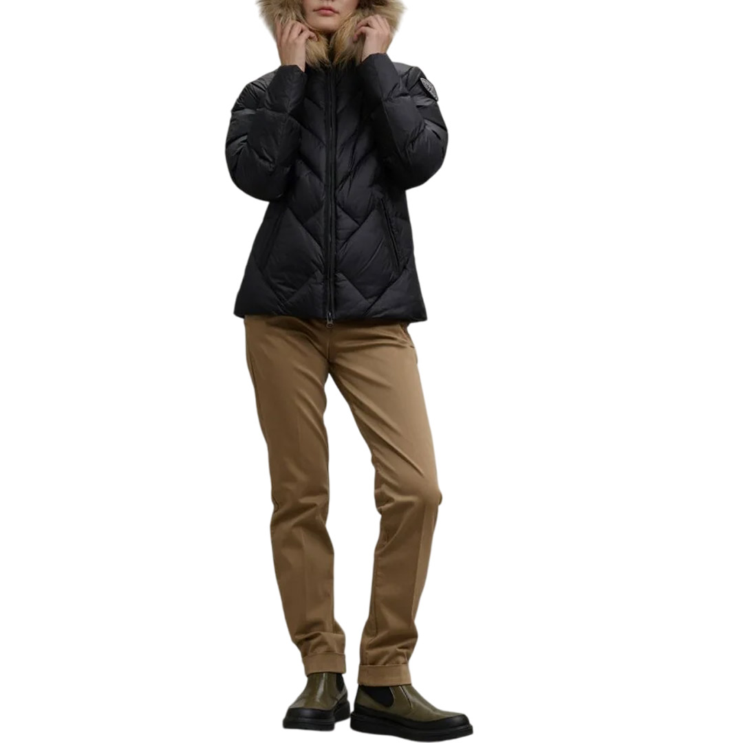 Piumino idrorepellente trapuntato a linee geometriche. Piumino sfiancato per donare risalto al punto vita. • Cappuccio fisso • Bordo in vera pelliccia removibile • Realizzato in nylon lucido • Foderato in nylon contrasto colore • Imbottito piuma 90/10 gr.255 • Chiusura con zip nascosta • Tasche con zip • Tasche interne con velcro e zip. • Coulisse sul fondo • Patch glitterato e passante con logo
