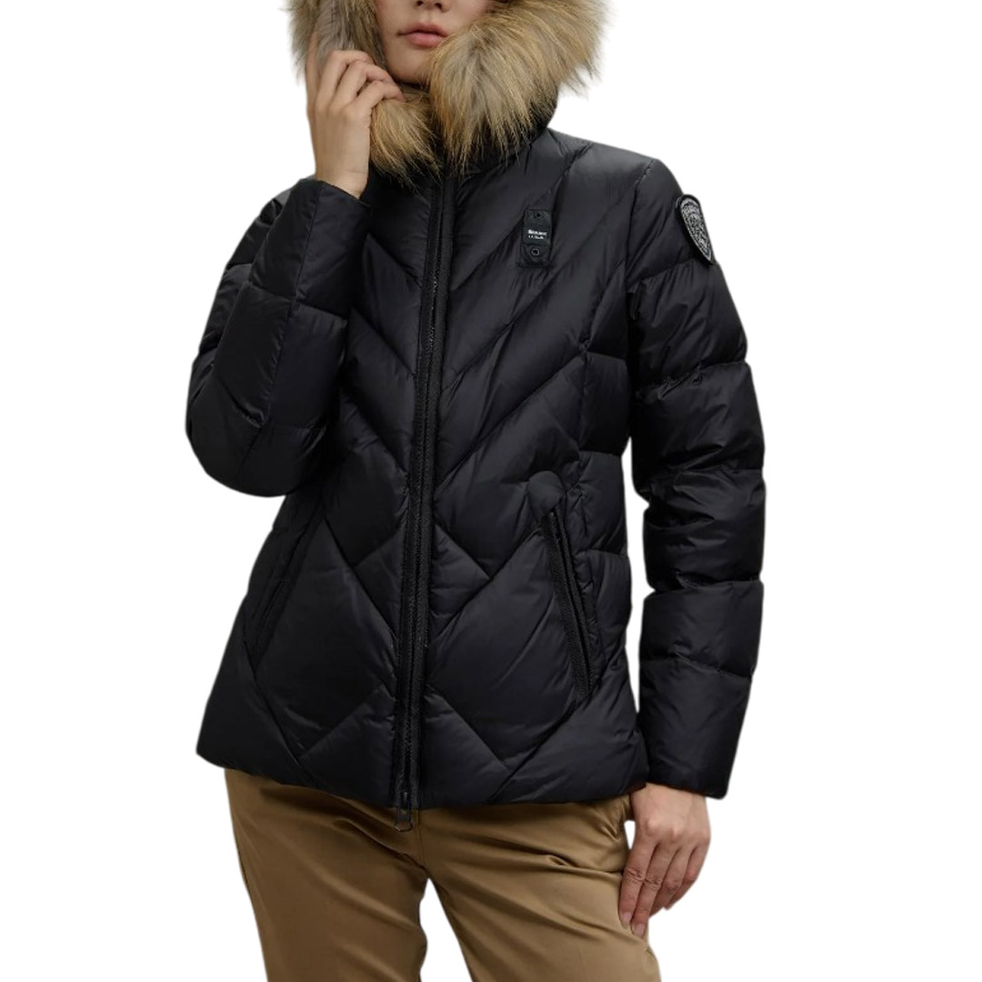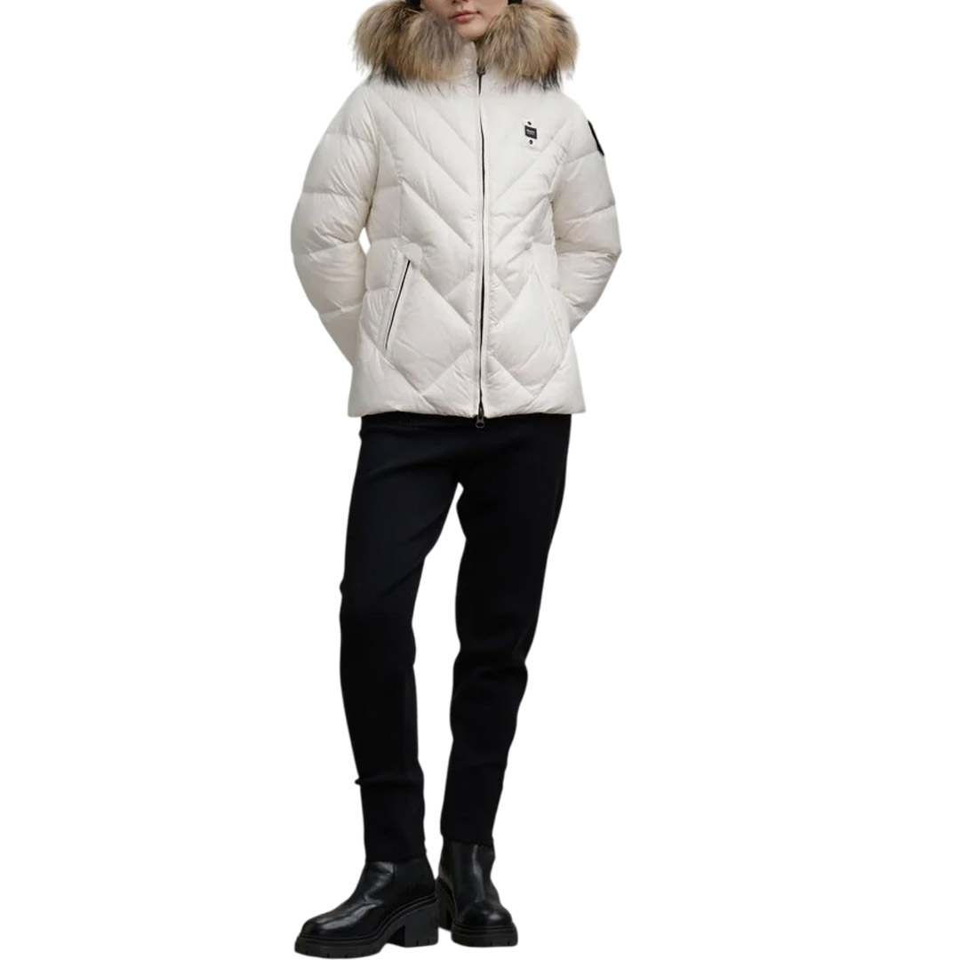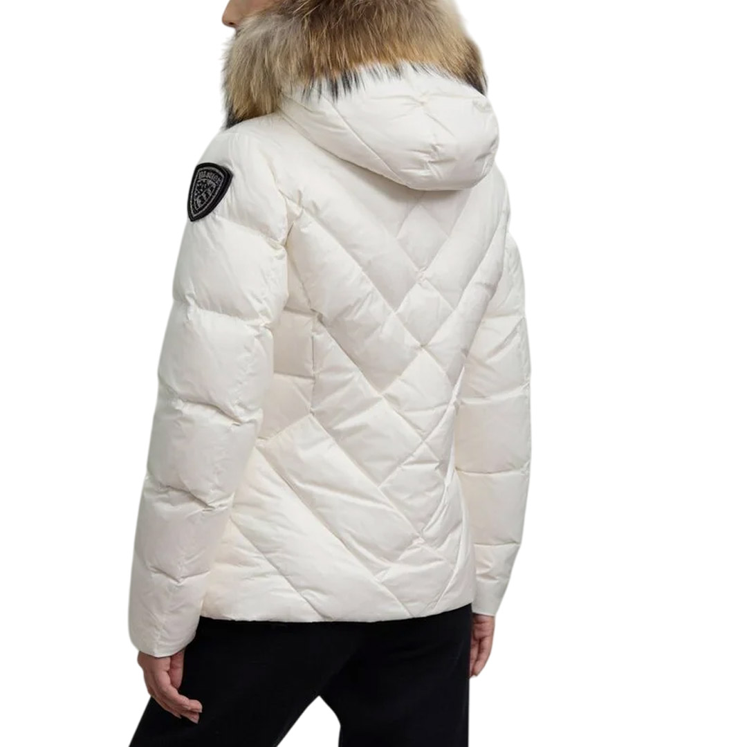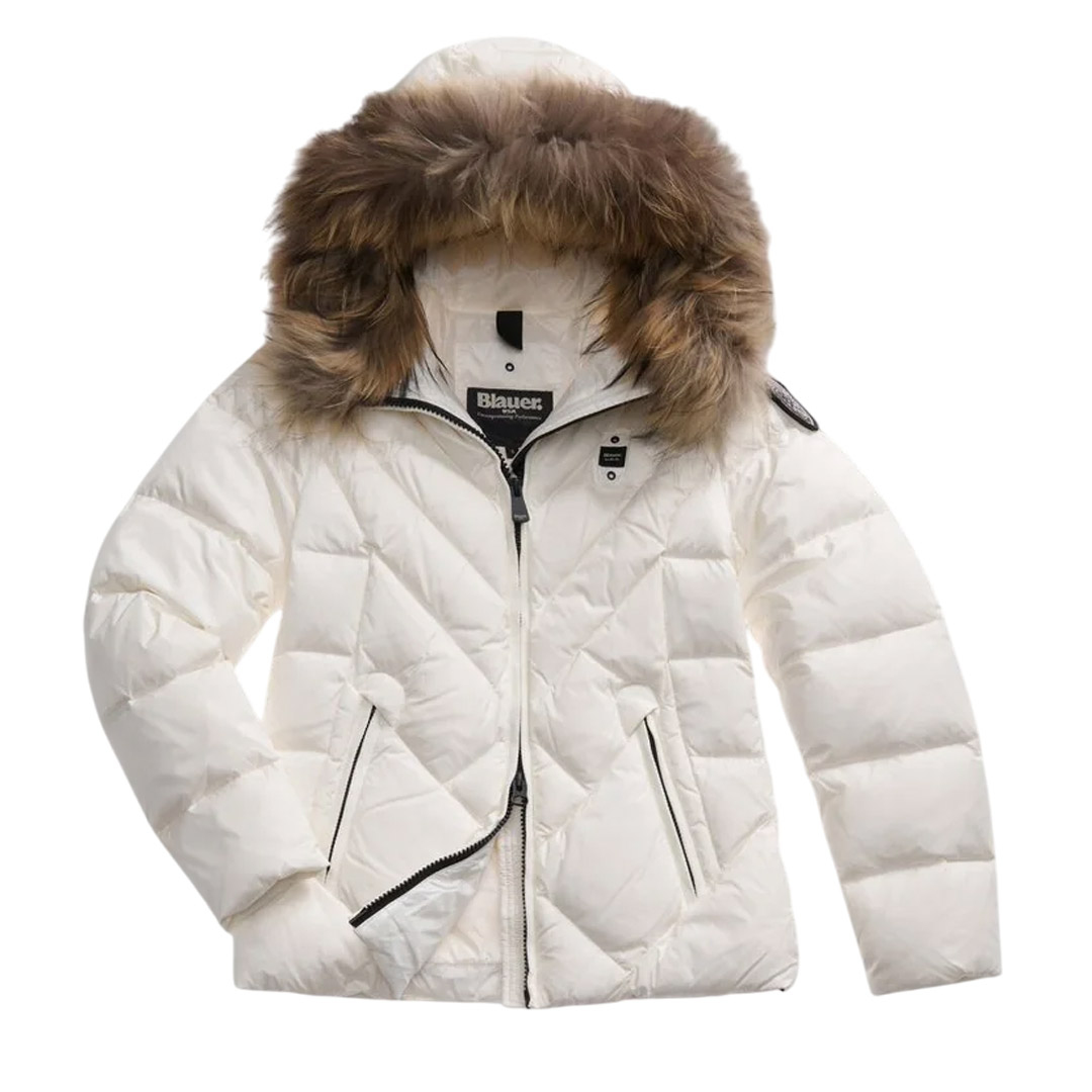 Piumino idrorepellente trapuntato a linee geometriche. Piumino sfiancato per donare risalto al punto vita. • Cappuccio fisso • Bordo in vera pelliccia removibile • Realizzato in nylon lucido • Foderato in nylon contrasto colore • Imbottito piuma 90/10 gr.255 • Chiusura con zip nascosta • Tasche con zip • Tasche interne con velcro e zip. • Coulisse sul fondo • Patch glitterato e passante con logo
