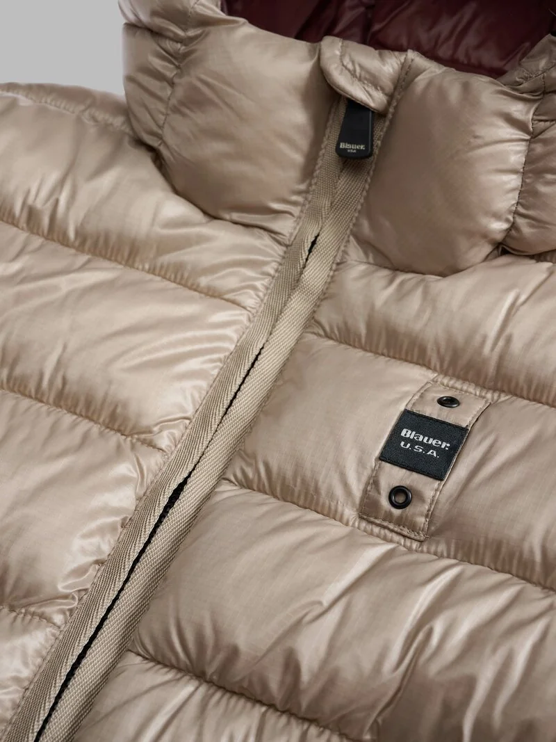 Giubbetto invernale in nylon idrorepellente micro rip. Imbottitura sostenibile, effetto sfiancato dai colori moda. • Cappuccio fisso con coulisse • Realizzato in nylon micro rip con leggero motivo check • Foderato in nylon in contrasto • Imbottito ovatta Sorona® Aura • Chiusura con zip nascosta • Copri cursore sul collo • Tasche con zip e copri cursore • Coulisse sul fondo • Tasche interne una con zip e l’altra con velcro • Patch e passante con logo