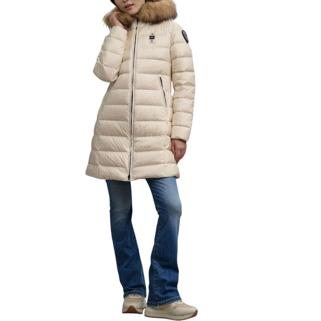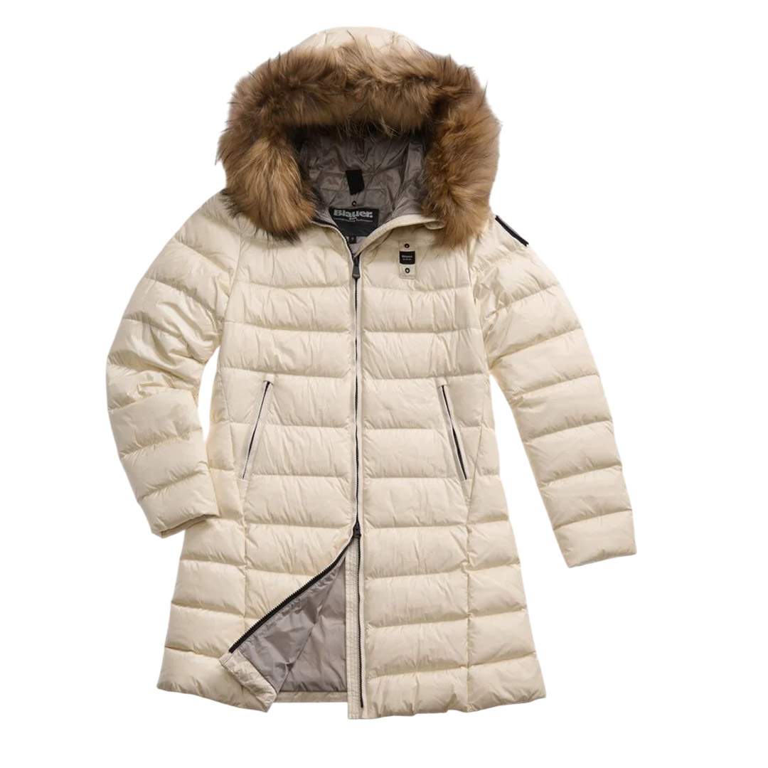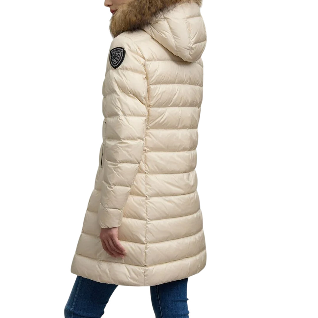 Piumino lucido lungo trapuntato a righe orizzontali con cappuccio fisso, bordo in pelliccia removibile ed interno in contrasto colore. Capo donna con colori fashion e dal taglio che risalta il punto vita. • Cappuccio fisso • Vera pelliccia di procione removibile • Foderato in contrasto colore • Imbottito piuma 90/10 gr.215 • Chiusura con zip nascosta • Copri cursore sul collo • Tasche con zip • Tasche interne con velcro e zip. • Patch glitterato e passante con logo