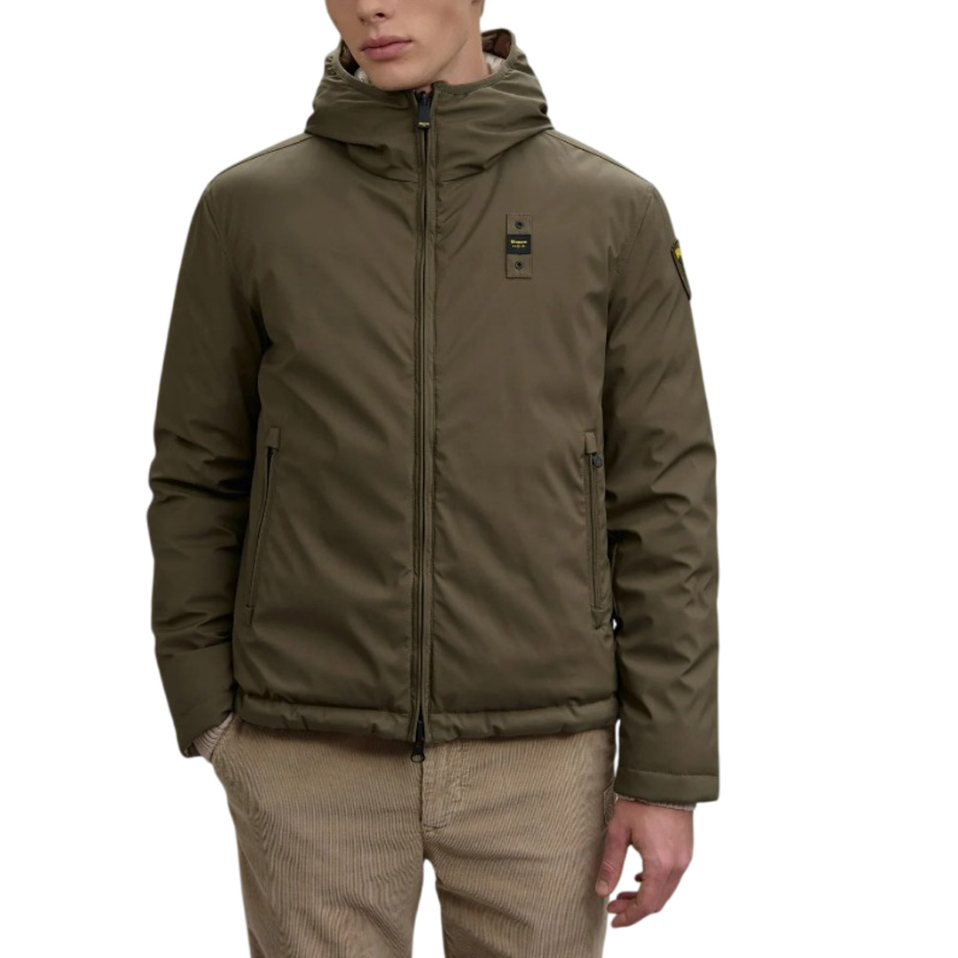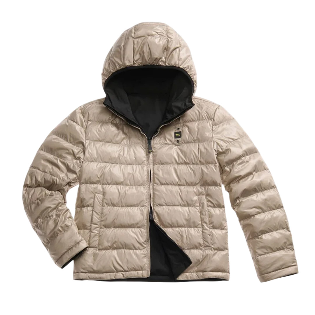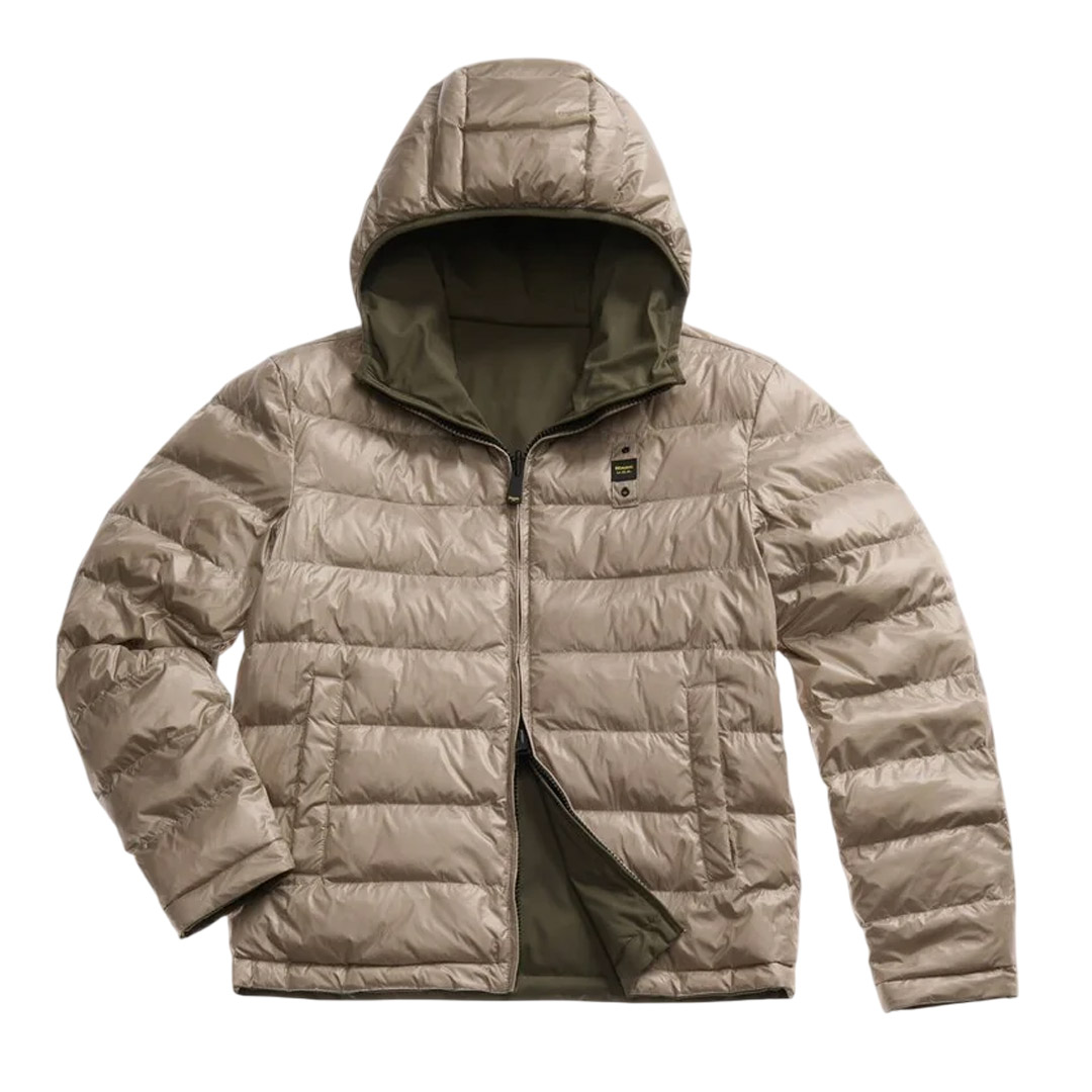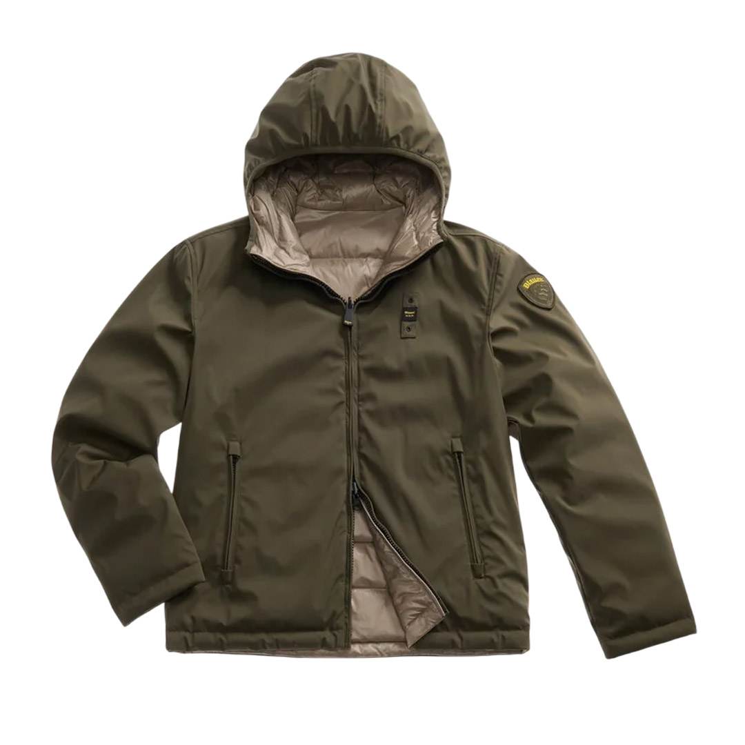 Piumino idrorepellente reversibile liscio da un lato e trapuntato a righe orizzontali dall’altro. Capo versatile da utilizzare in due versioni una più elegante e una più casual. • Cappuccio fisso con bordo in lycra • Realizzato in neoprene liscio da un lato • Realizzato in nylon lucido dall’altro • Imbottito 50% piuma e 50% ovatta • Chiusura con zip reversibile • Tasche con zip da un lato e con automatico dall’altro • Patch all’esterno e passante con logo in entrambi i lati