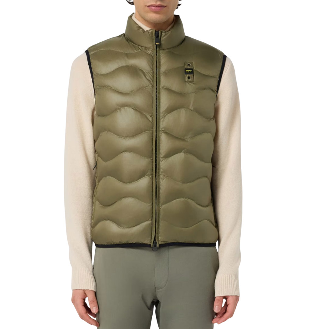 Giubbetto senza maniche con leggero motivo check, imbottitura sostenibile impunturata ad onde e fodera in contrasto colore • Chiusura con zip • Imbottito ovatta Sorona® • Due tasche con zip • Profilo in lycra sul giro maniche e fondo • Tasche interne con velcro • Passante con logo
