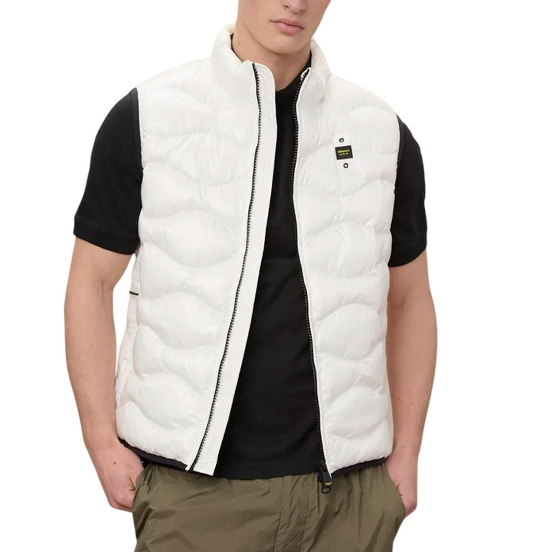 Giubbetto senza maniche con leggero motivo check, imbottitura sostenibile impunturata ad onde e fodera in contrasto colore • Chiusura con zip • Imbottito ovatta Sorona® • Due tasche con zip • Profilo in lycra sul giro maniche e fondo • Tasche interne con velcro • Passante con logo