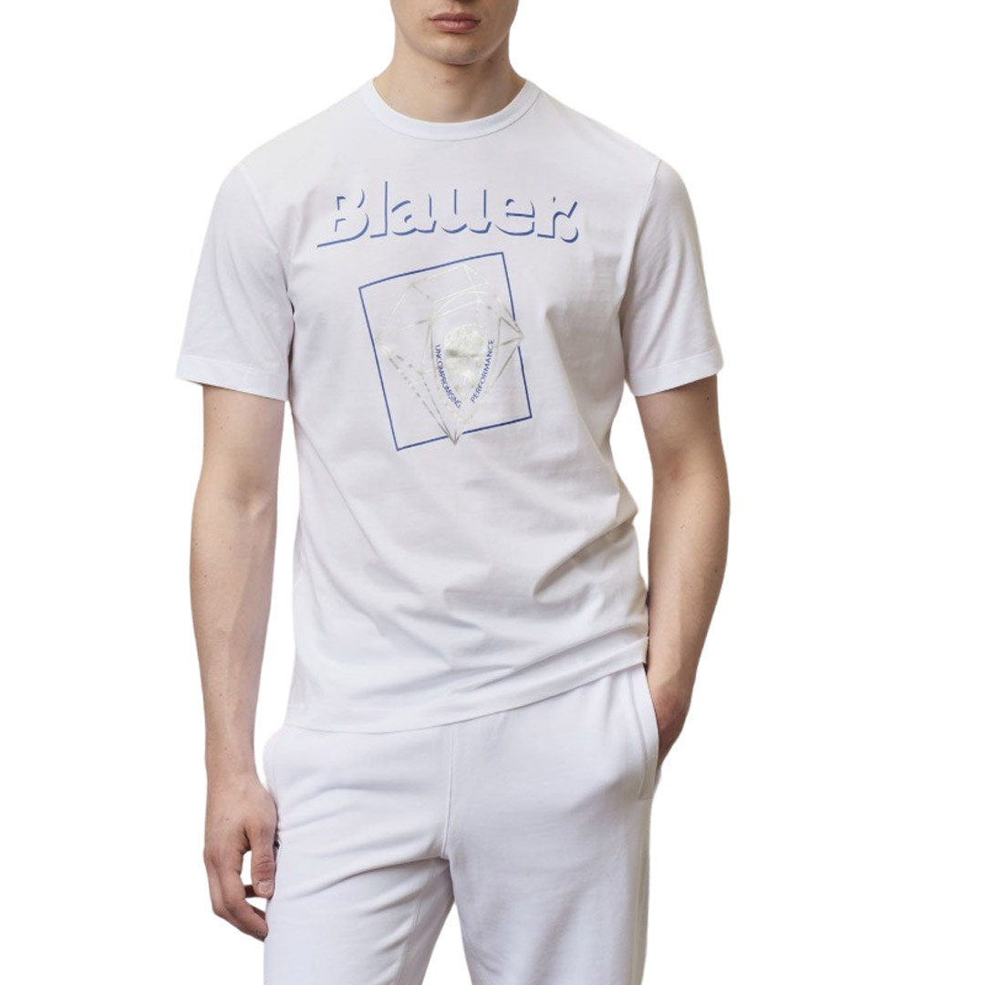 T-shirt da uomo a manica corta con girocollo a costine. Stampa con grafica 3D sul davanti e scudetto con scritta “Uncompromising Performance” al centro. Sopra, scritta Blauer tono su tono con effetto profondità in colore a contrasto.