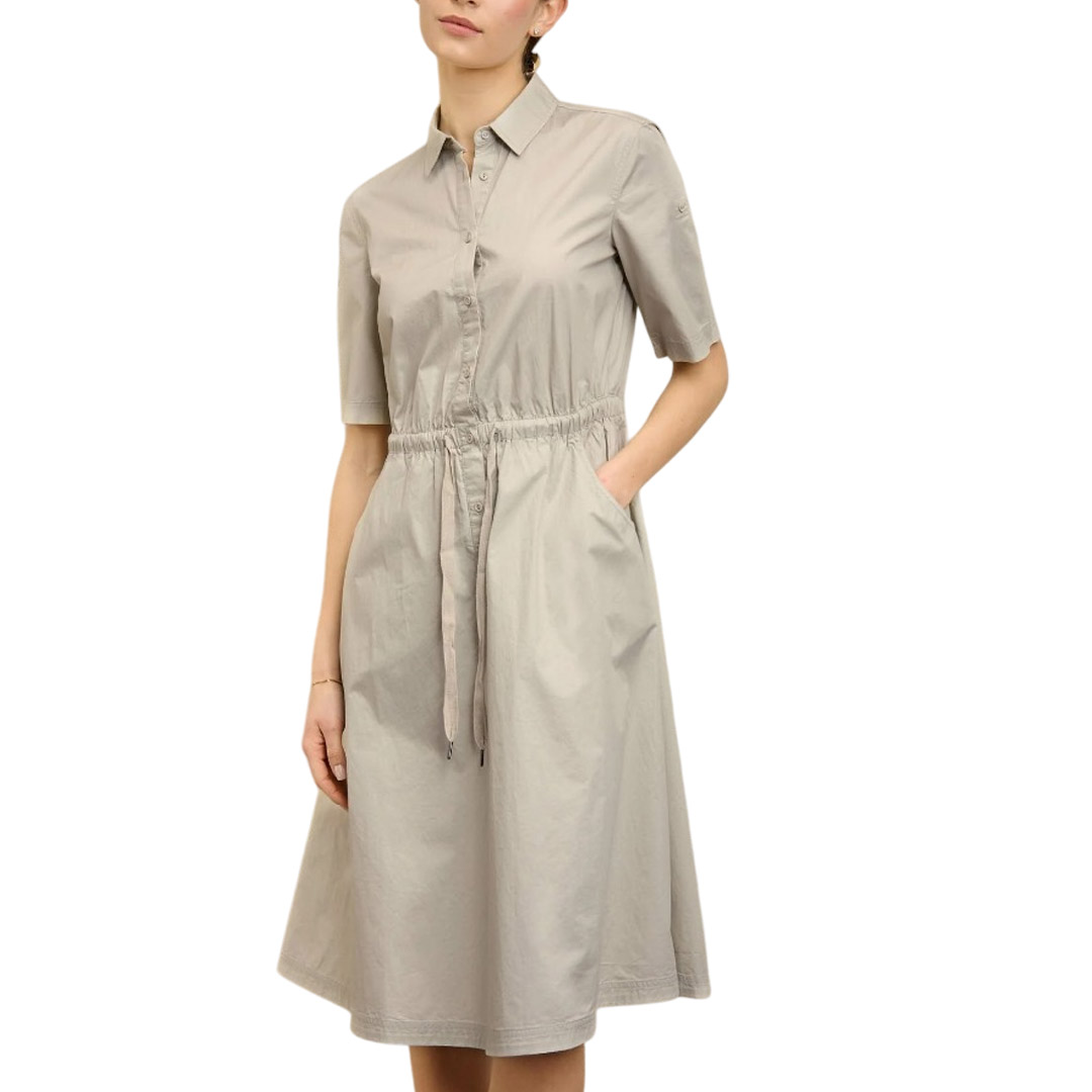 Vestito chiuso con collo a camicia e profonda scollatura fermata da bottoni; manica corta con linguetta interna e bottone. • Due tasche sui fianchi • Elastico in vita dall’effetto arricciato • Coulisse a spina di pesce interna con fiocco sul davanti • Passante logato dietro nel collo