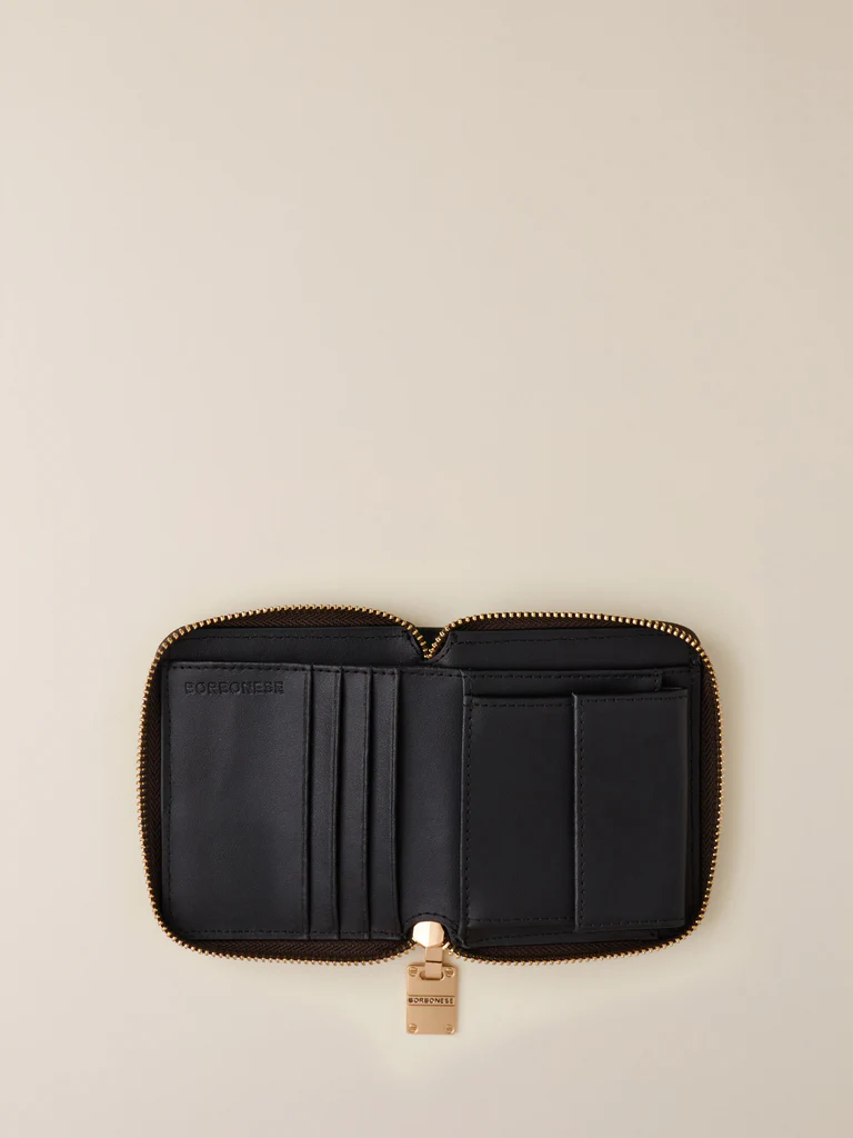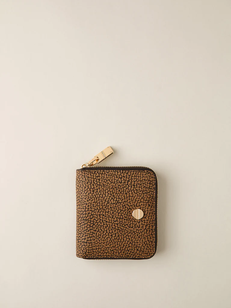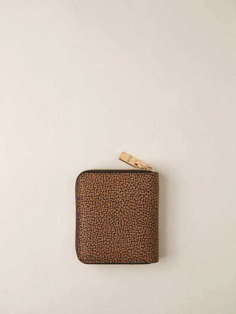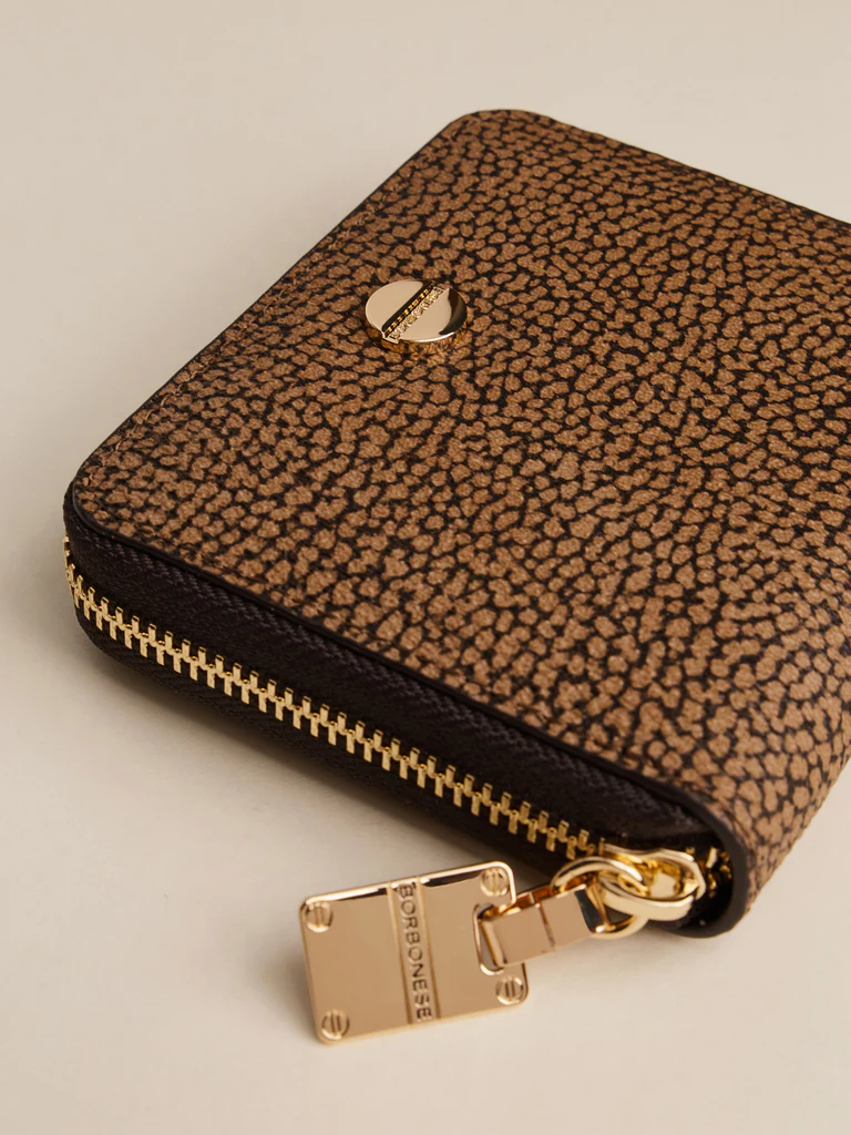 Tela Rivestita OP Dettagli di Pelle Chiusura su tre lati regolata da zip L'iconica vite funge da tirazip e da motivo decorativo applicata sul fronte Interno con portamonete e portatessere Interno foderato in tessuto jacquard con schermo anti-clonazione carte Metallerie Oro Chiaro Misura Medium Larghezza 11 cm Altezza 10 cm Profondità 2 cm