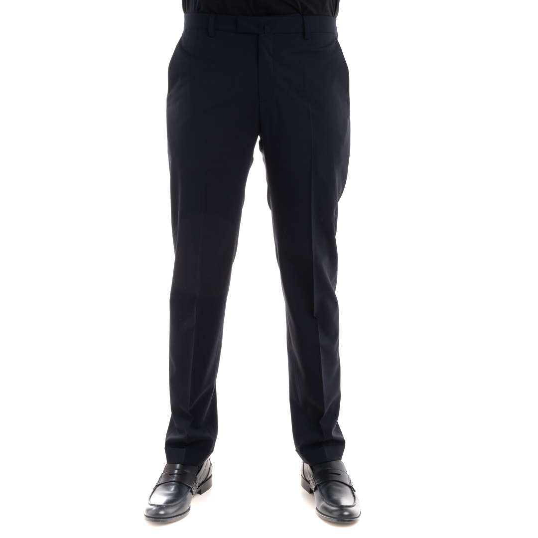 Pantalone in fresco lana a vita media Chiusura con zip e bottoni. Tasche a filetto laterali e posteriori più taschino avanti. Gamba slim con doppio risvolto sul fondo.