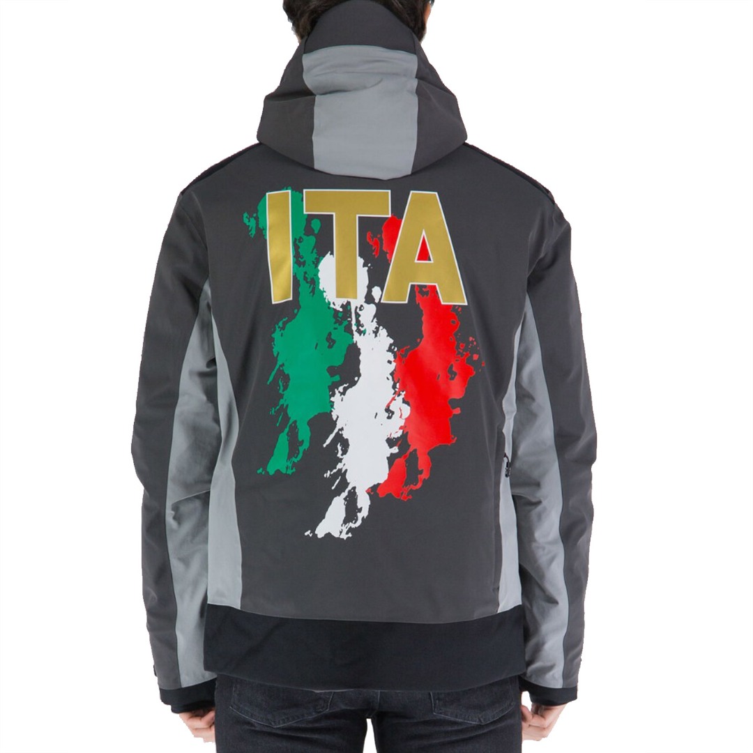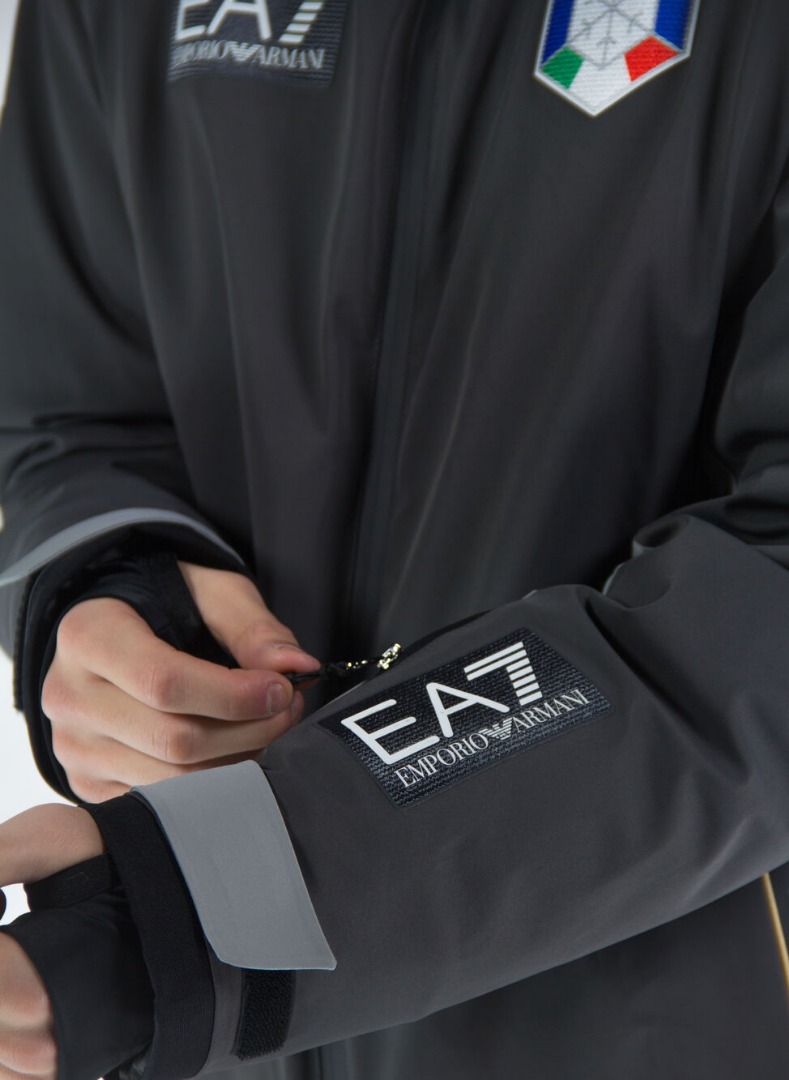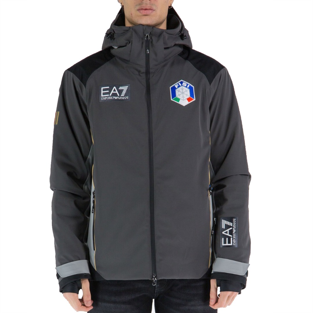 Giacca da neve per uomo firmata EA7. La collezione Fisi è realizzata nell'innovativo tessuto tecnico PROTECTUM7, che presenta una membrana impermeabile resistente fino a 20.000 mm di colonna d'acqua e altamente traspirante. Il modello presenta cappuccio regolabile con coulisse, comode e pratiche tasche zippate ed è impreziosito da i loghi FISI e EA7 istituzionali e dalla maxi stampa ITA realizzata in luminose lettere oro, incorniciate dalla suggestiva grafica tricolore. Tasche multiple con cerniera e tasche interne. Ghetta interna staccabile. Il capo, interamente termonastrato e con rinforzi in cordura, presenta un'Imbottitura in ARDOR7 RECYCLED, un nuovo isolante alternativo alla piuma, costituito da una miscela innovativa di microfibre di poliestere con proprietà termiche avanzate. Le sue caratteristiche principali sono l'impermeabilità, la traspirabilità, il comfort e una morbidezza simile alla piuma; questa tecnologia assicura maggiore calore e migliori prestazioni contro l'umidità rispetto alla piuma naturale, a parità di volume.