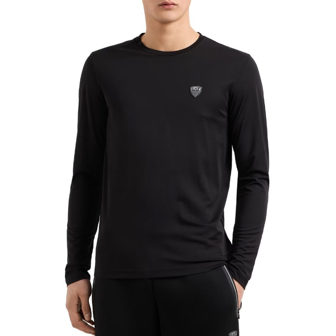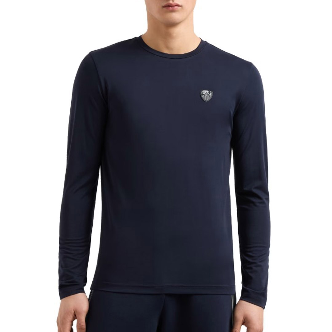 T-shirt girocollo a maniche lunghe realizzata in jersey di misto viscosa stretch, impreziosita dal logo a scudo EA7 dal finish metallizzato. Un capo versatile e confortevole, perfetto complemento di look sportivi. Vestibilità slim Girocollo Maniche lunghe Logo a scudo EA7 dal finish metallizzato