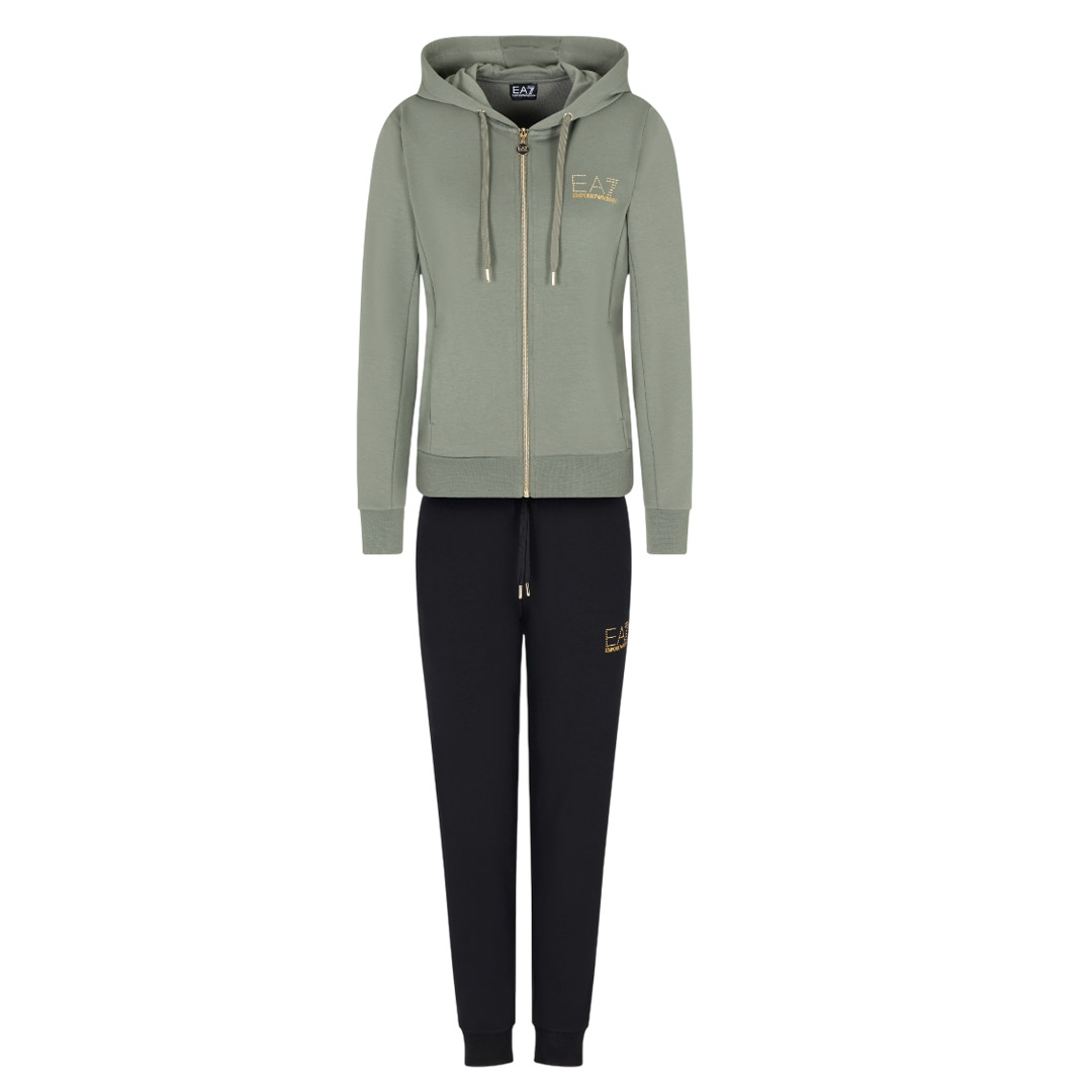 Linea urban per questa tuta in misto viscosa, composta da una felpa con cappuccio, due pratiche tasche laterali e chiusura a zip, e un paio di jogger morbidi e confortevoli. Un modello versatile, perfetto per la palestra e per i momenti di relax. Tuta composta da: Felpa con cappuccio, due tasche laterali, profili elasticizzati, logo EA7 sul petto con finitura oro chiaro Pantaloni jogger con coulisse, due tasche laterali, fondo caviglia elasticizzato, logo EA7 sulla gamba sinistra