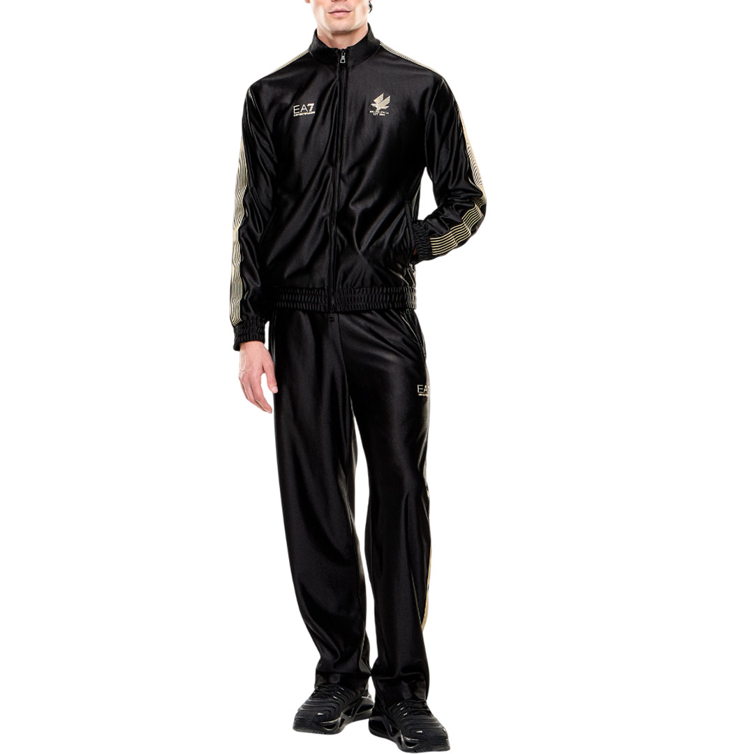 Tuta realizzata in tessuto tecnico dal particolare finish shiny, dalla vestibilità regular, parte della proposta Soccer. Il modello si compone di una felpa con zip e tasche laterali e un pantalone con coulisse in vita, entrambi personalizzati dal logo EA7 a contrasto e dal logo di colleione. con finitura gold. Il modello è parte della proposta Soccer, che presenta elementi che rimandano al mondo del calcio, ed è caratterizzata inoltre dal logo EA7 impresso sul petto e il logo Eagle stilizzato.
