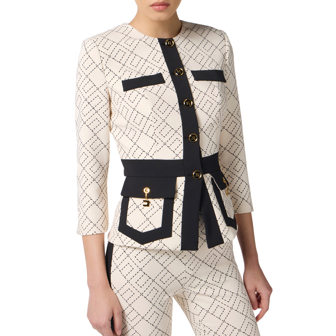 Look grafico per questo mini abito Elisabetta Franchi che abbina al design color block una stampa logo geometrica che crea un pattern ipnotico lungo tutta la silhouette. Maniche a tre quarti e scollatura a V con colletto, quest'ultimo è abbellito da occhielli con pendente logo che ritornano come motivo decorativo anche delle tasche applicate sul fronte. Bottoni gioiello completano l'insieme Taglio corto e aderente Chiusura con zip sul retro Gemelli con logo charm Maniche a tre quarti