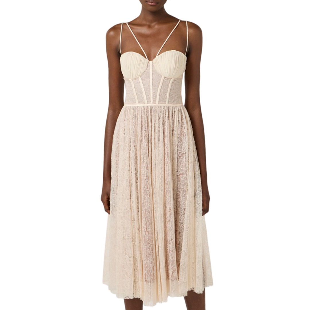 Abito in pizzo. Il vestito ha costruzione a bustier con coppe e piattine in raso a scolpire la figura. Si distingue per la gonna a ruota che esalta la trama con disegni floreali, in un movimento dinamico e raffinato. Spalline personalizzate con dettagli logo. Vestibilità regular. Fodera in georgette Dettagli in metallo dorato con logo Zip sul retro