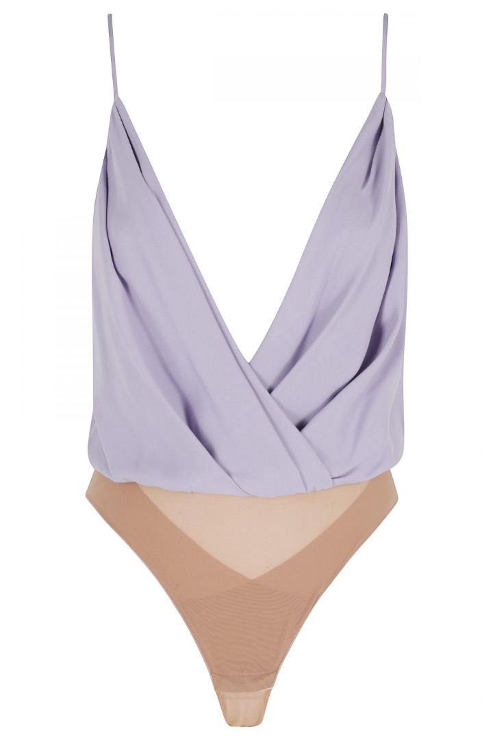 Body in georgette di viscosa con scollo sovrapposto e spalline incrociate sul retro, trattenute dal dettaglio in metallo dorato con logo che aggiunge una nota luminosa. Vestibilità regular. Slip in tulle Dettaglio in metallo dorato con logo