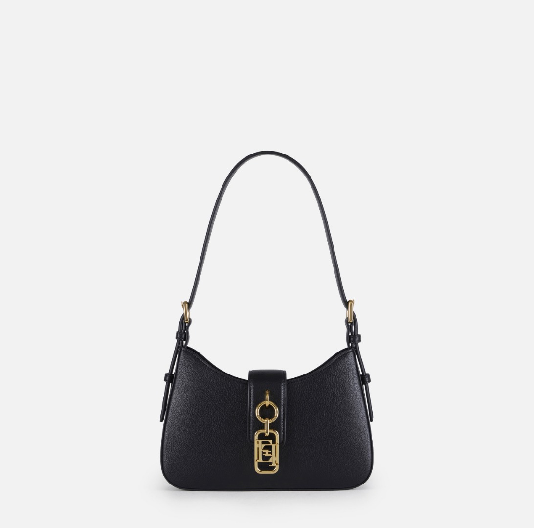 Borsa hobo piccola realizzata in materiale sintetico con texture effetto pelle. L'accessorio ha manico con fibbie e chiusura con linguetta, impreziosita dal dettaglio di charm con logo. Accessorio in metallo dorato con logo Fodera interna Dimensioni 15,5 x 22 x 5 cm