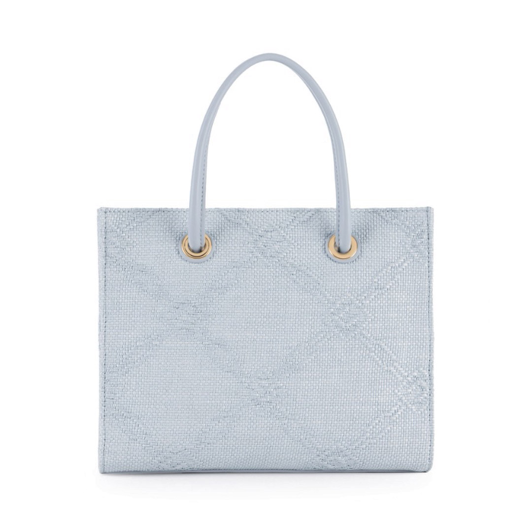 Borsa tote piccola realizzata in rafia jacquard con disegno a losanghe, impreziosita da dettagli in metallo dorato per una nota di luce. Una patch con logo ricamato completa l'accessorio. Anelle in metallo dorato Patch con logo Dimensioni 25 x 20 x 12 cm