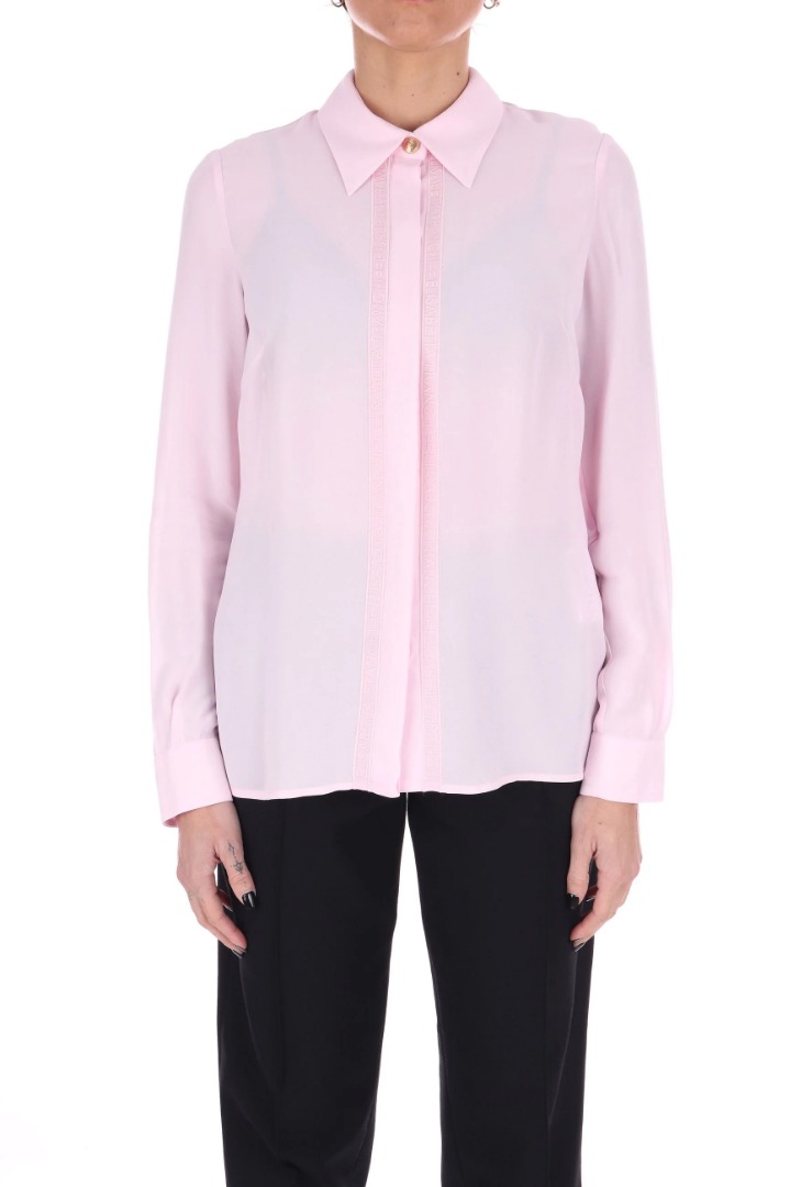 Camicia regular in georgette di viscosa dalla linea pulita. Il capo ha maniche lunghe e si distingue per il cannoncino decorato dal motivo di bande in organza ricamate con logo lettering. Note di luce con il primo bottone visibile e quelli sui polsi in tonalità dorate. Dettaglio in organza con logo ricamato Bottoni in metallo dorato con logo Chiusura nascosta