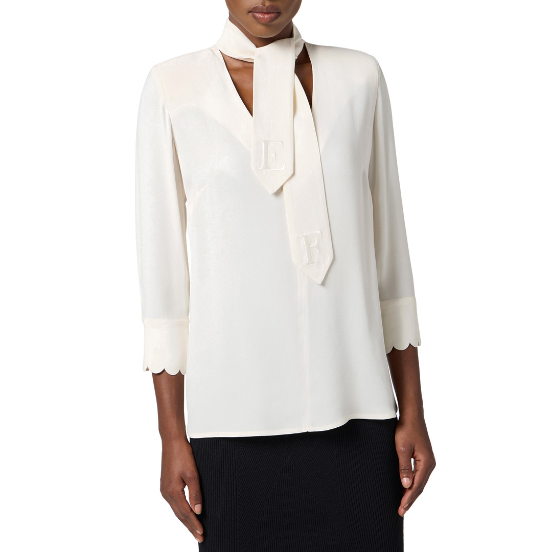 Camicia in georgette dalla vestibilità regular. Si distingue per lo scollo con fusciacca in tono e ricamata con logo alle estremità. I polsi con smerlo aggiungono una nota delicata. Bottoni in metallo dorato con logo. Bottoni in metallo dorato con logo Spalline imbottite