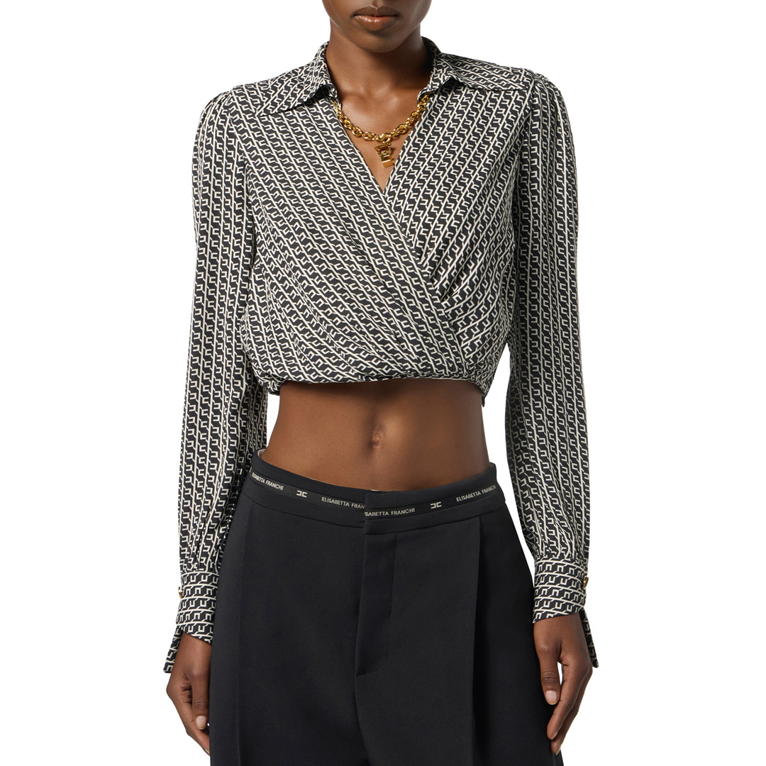 Camicia cropped in georgette dalla vestibilità slim. Ha collo a camicia con scollo a V incrociato, maniche lunghe con polsi asimmetrici ed è illuminata dal dettaglio gioiello in catena con logo, amovibile per sperimentare più opzioni di styling. Bottoni smaltati sui polsi. Spalline imbottite Accessorio gioiello in metallo dorato con logo Bottoni smaltati con logo