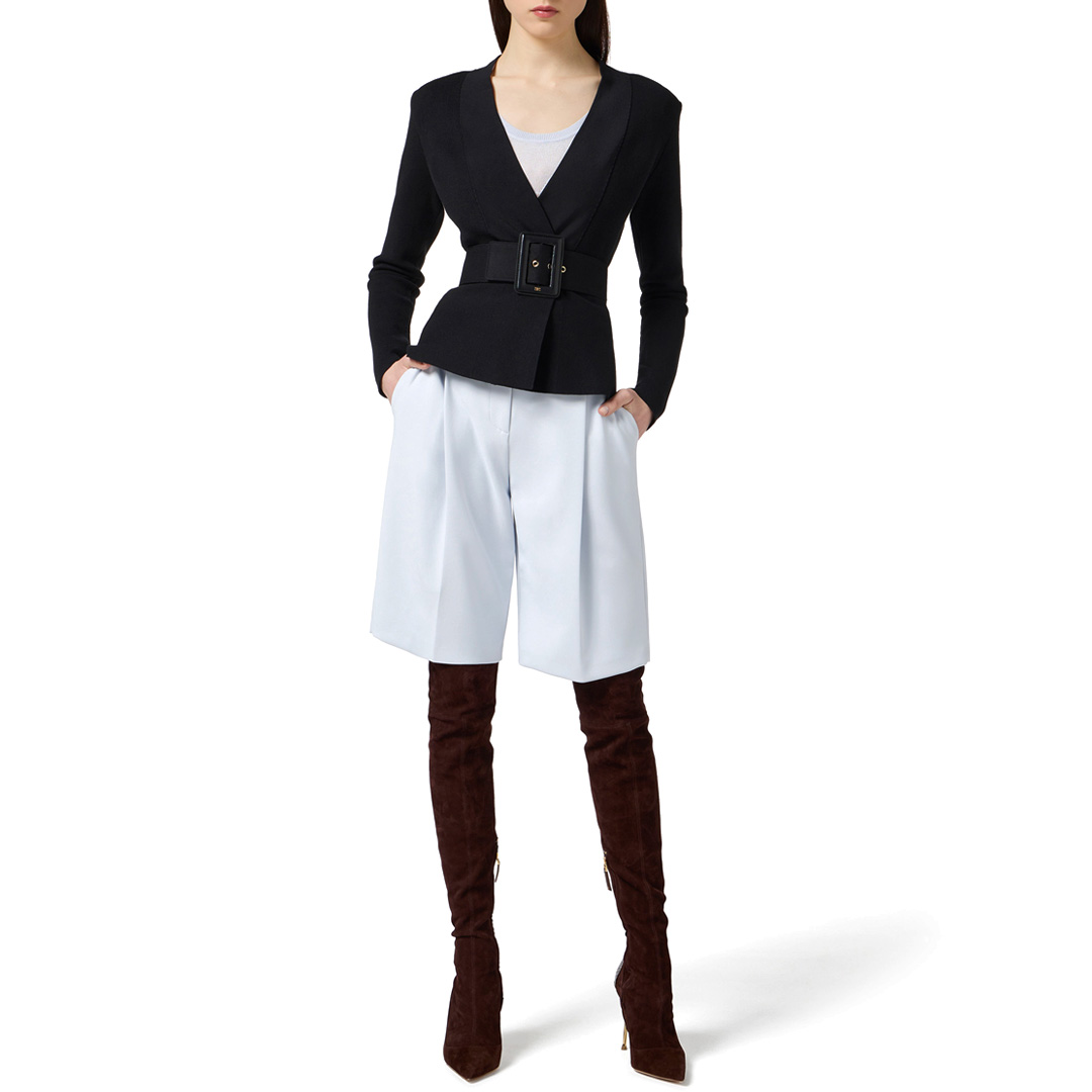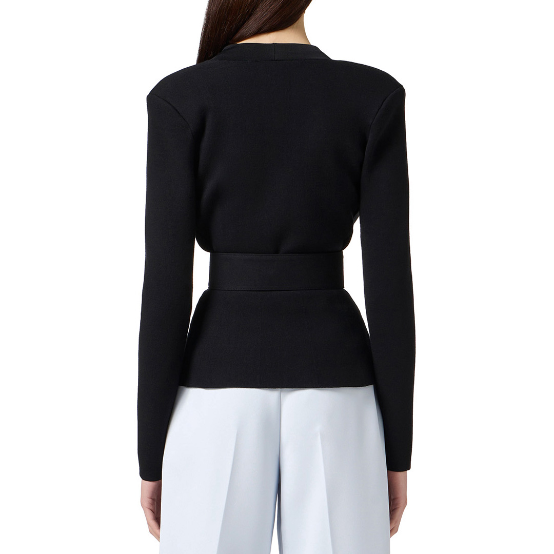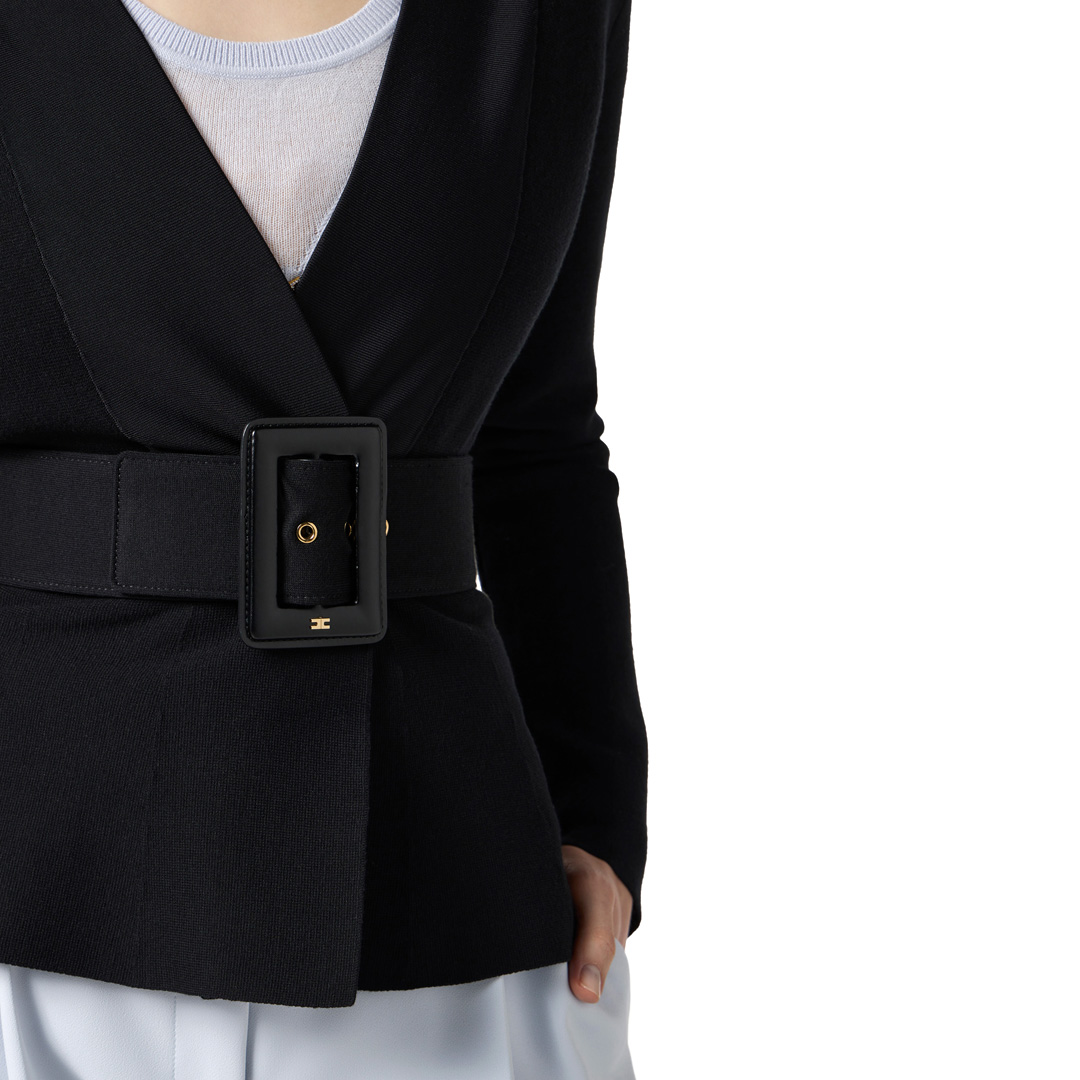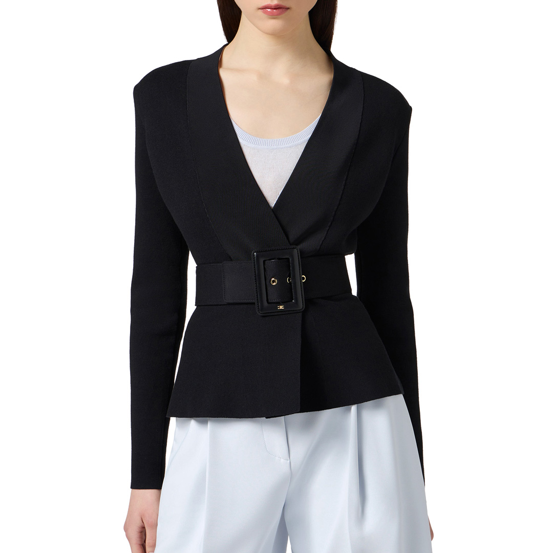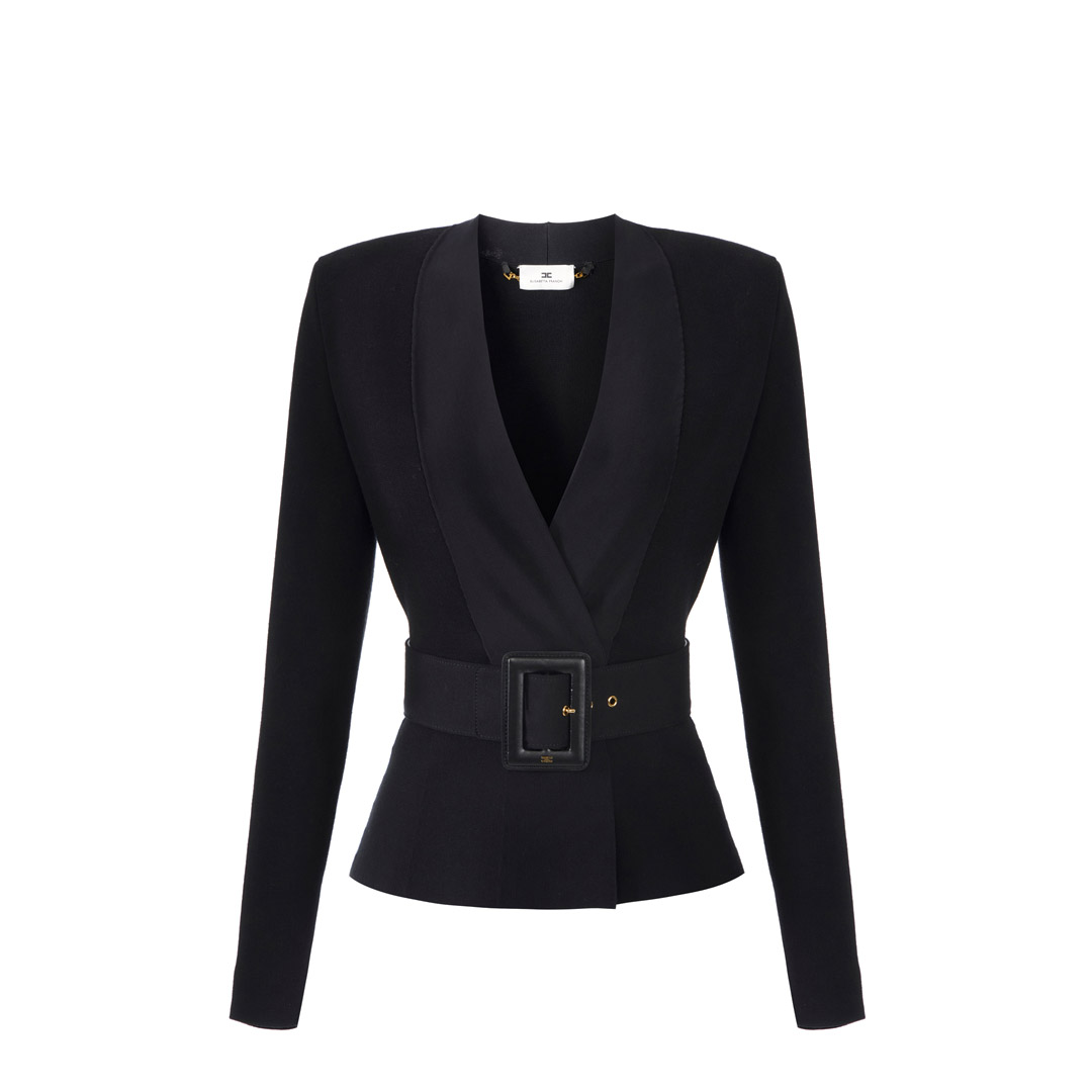 Giacca in maglia con lavorazione a punto stoffa. Il blazer ha spalle strutturate e si distingue per il rever realizzato in viscosa lucida che crea interessanti contrasti di texture. La cintura coordinata esalta la baschina al fondo capo, regalando una silhouette decisa e definita. Vestibilità slim. Giacca in maglia con lavorazione a punto stoffa. Il blazer ha spalle strutturate e si distingue per il rever realizzato in viscosa lucida che crea interessanti contrasti di texture. La cintura coordinata esalta la baschina al fondo capo, regalando una silhouette decisa e definita. Vestibilità slim. Spalline imbottite Bottoni automatici interni Cintura con fibbia