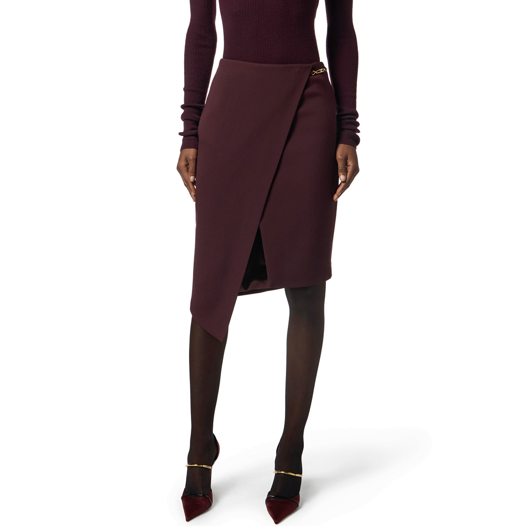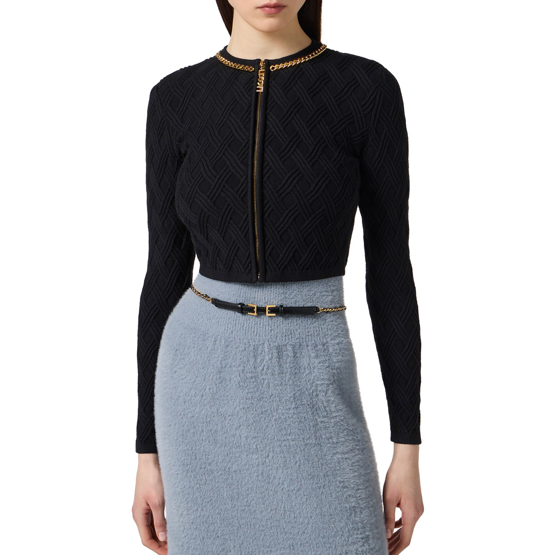 Gonna a tubo in maglia dalla vestibilità aderente. Con vita alta, si distingue per l'elaborata lavorazione 3D che crea un disegno geometrico a rombi su tutta la lunghezza. Impreziosita dalla catena diamantata con logo e strass che decora il punto vita Dettaglio gioiello in metallo dorato con logo e strass Chiusura con zip