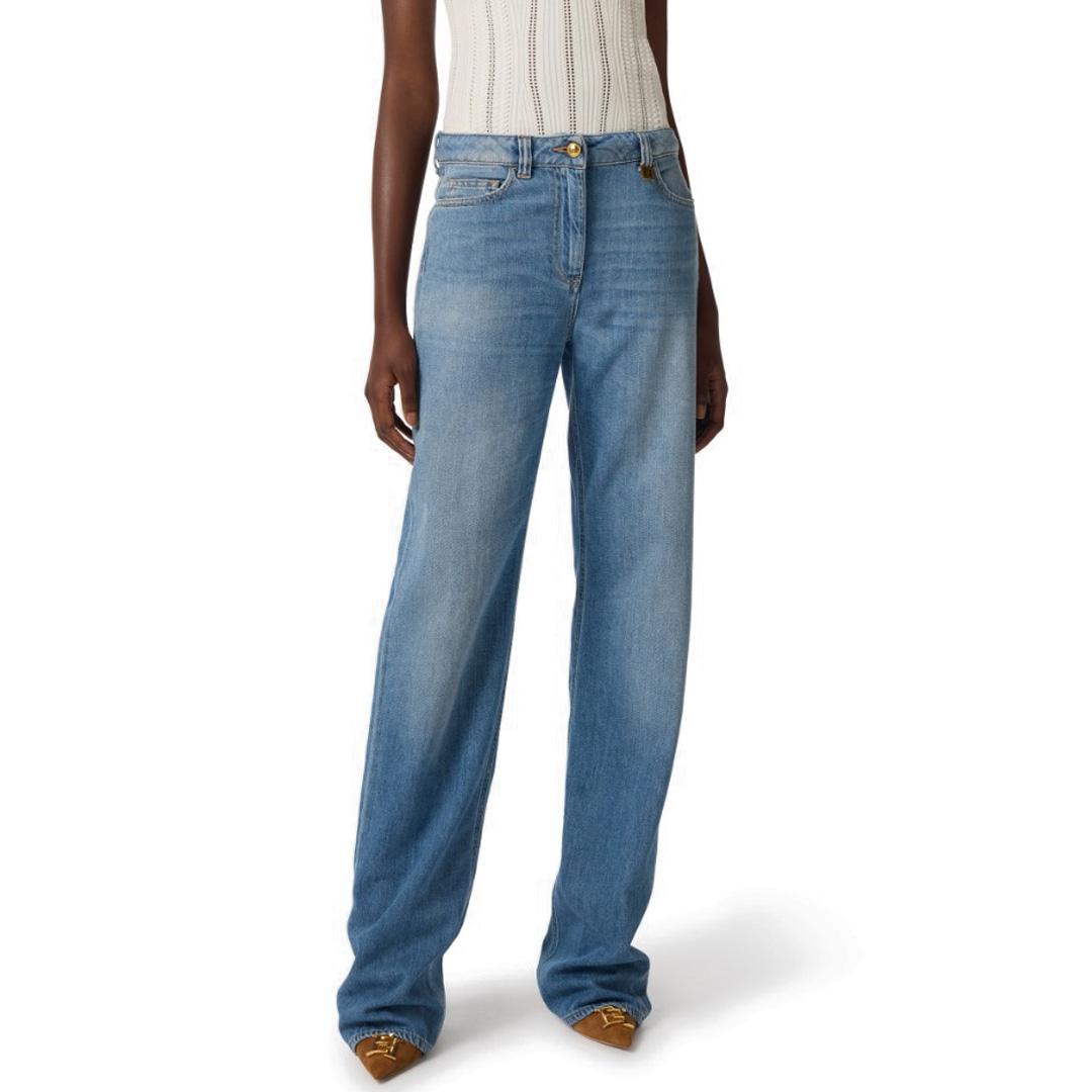 Pantaloni in denim costruiti con vita bassa e gamba a palazzo. Focus sui dettagli: la placca con logo impreziosisce un passante, il bottone in metallo dorato illumina il fascione. Sul retro, tasche applicate di cui una personalizzata dal nastro diagonale con logo. Vestibilità over. Dettaglio in metallo dorato con logo Bottone in metallo dorato con logo Tasche sul retro
