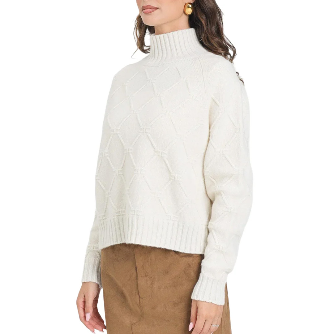 Pullover boxy in maglia dalla vestibilità over. Il capo ha collo alto, maniche lunghe e bordi rifiniti a coste. Si distingue per il pattern con losanghe in trama jacquard, a donare tridimensionalità e compattezza alla texture. L'etichetta con logo sul retro del collo completa il capo. Etichetta con logo Vestibilità Over
