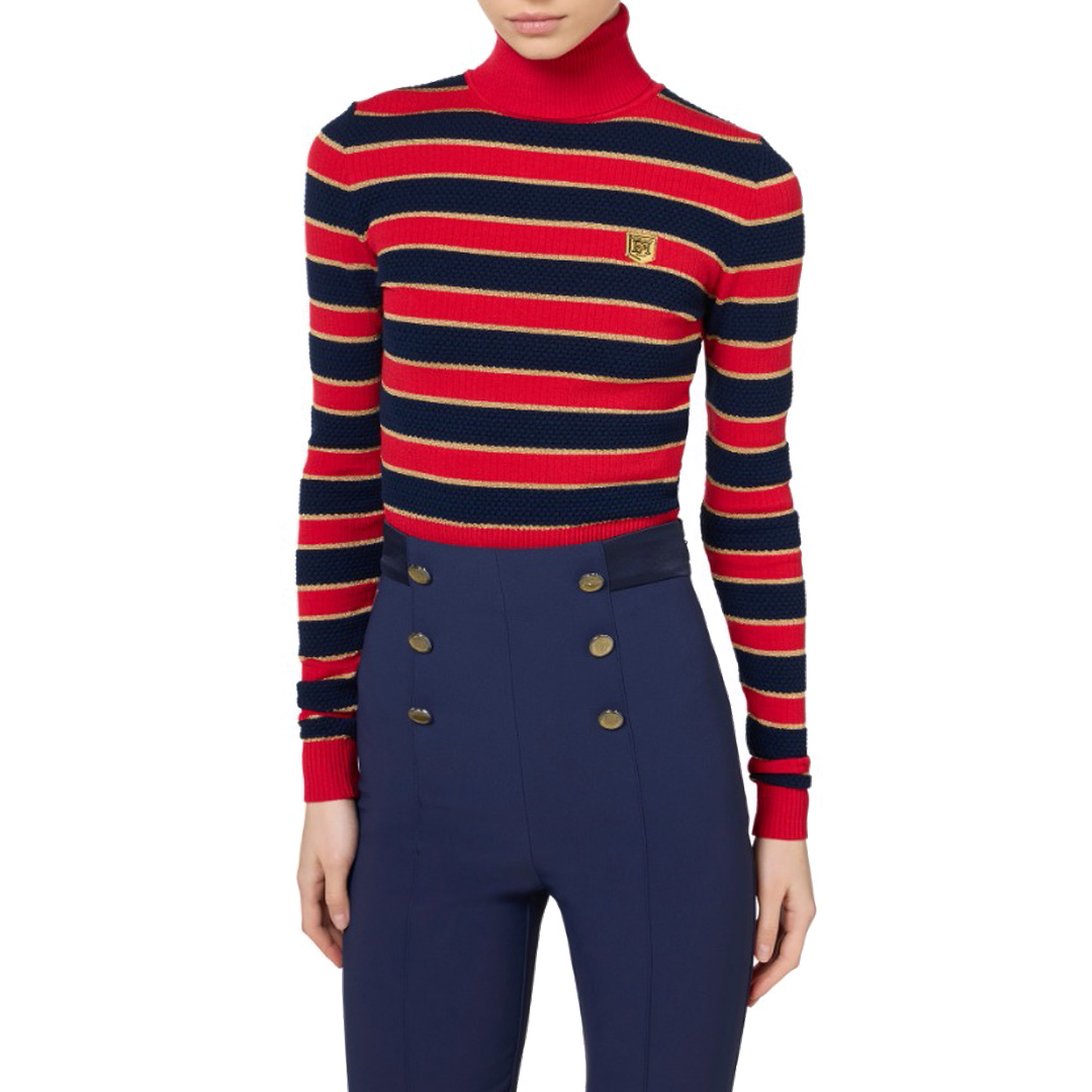Maglia cropped in viscosa a maniche lunghe con collo alto. È caratterizzato da un'alternanza di punto nido d'ape, costine e riga in filo lurex che crea tridimensionalità. Accessorio in metallo dorato Vestibilità slim