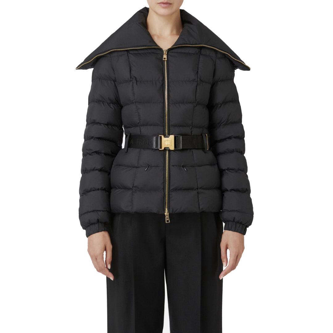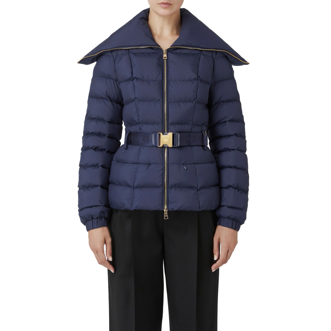 Piumino corto in nylon mano pesca con impunture quadrate e ampio collo. Il punto vita è enfatizzato da una cintura in elastico logato con fibbia in metallo dorato. Fodera in vela in tinta Zip in metallo dorato