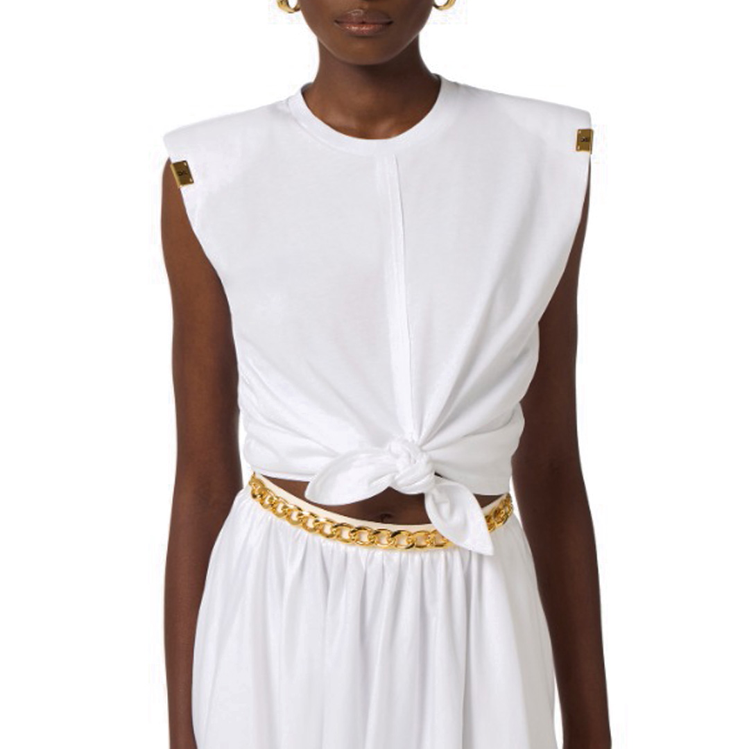 Maglietta in jersey. Ha girocollo, spalle strutturate ed è annodata al fondo per una silhouette definita. Le graffette sul giromanica e la stampa con logo sul retro aggiungono dettagli luminosi. Rifinita con inserti di passamaneria a taglio vivo e impunture. Vestibilità regular. Spalline imbottite Dettagli con logo Stampa con logo