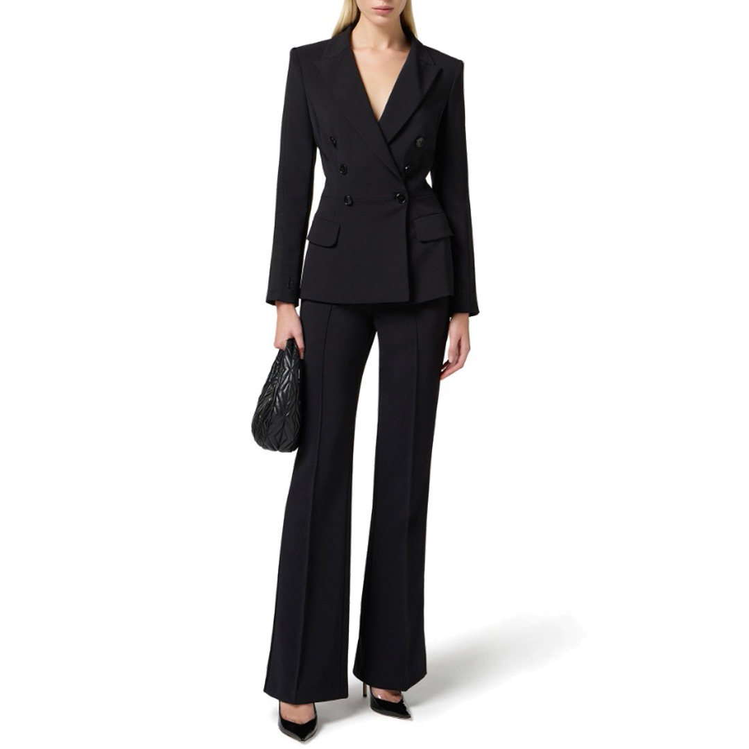 Tailleur in crêpe stretch composto di giacca doppiopetto con rever a lancia, patte, bottoni in tono e pantaloni svasati al fondo. Il completo è impreziosito dalle bande in raso laterali riprese sui filetti. Le iniziali del brand sono ricamate sui polsi e sulla vita. Vestibilità slim. Parte della collezione Essential, per costruire il guardaroba perfetto. Spalline imbottite Fodera in raso monogram Bottoni in tinta Inserti in raso Patte applicate Logo ricamato su polsi e fianco Zip invisibile