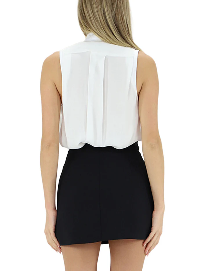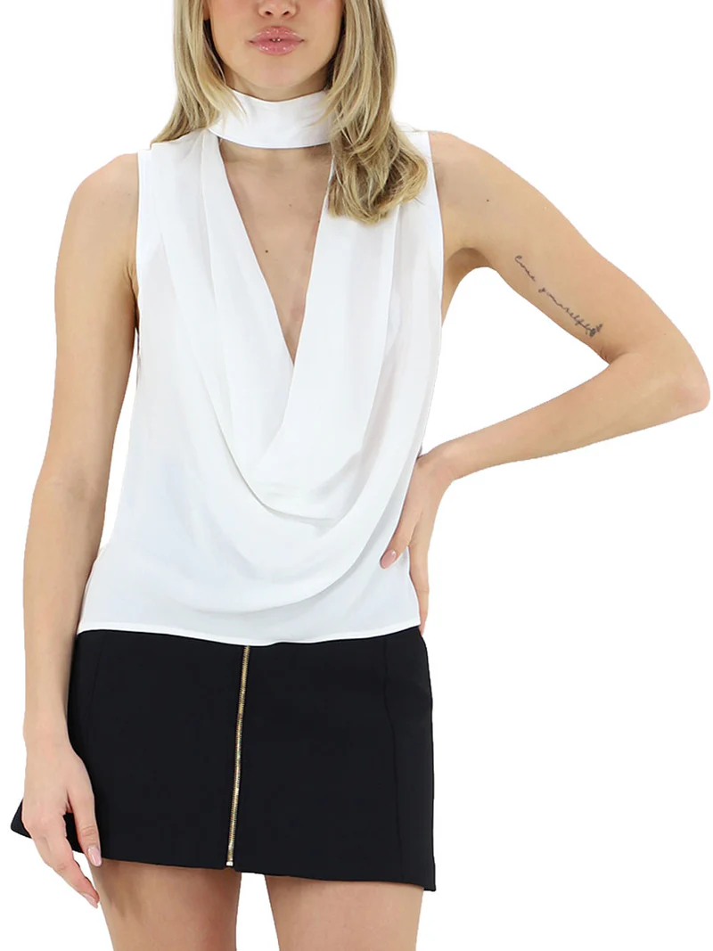 Top in georgette di viscosa, smanicato e rifinito con dettagli in raso. Ha collo illuminato da bottoni in metallo dorato con apertura che cade morbida sul davanti. Vestibilità regular. Bottoni in metallo dorato con logo
