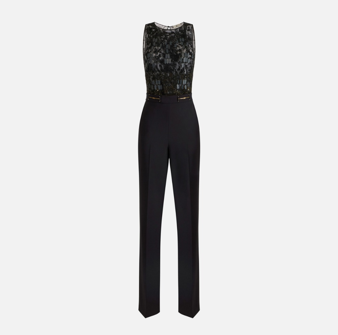 Tuta in crêpe smanicata con pantaloni a palazzo. Si distingue per il busto ricamato con paillettes e micro-cristalli che ricreano un effetto dégradé, in un mix di texture lucide e opache. Il fascione è decorato da morsetti in metallo dorato. Vestibilità regular. Dettagli in metallo dorato con logo Tasche alla francese Patte sul retro Chiusura con zip invisibile e gancio