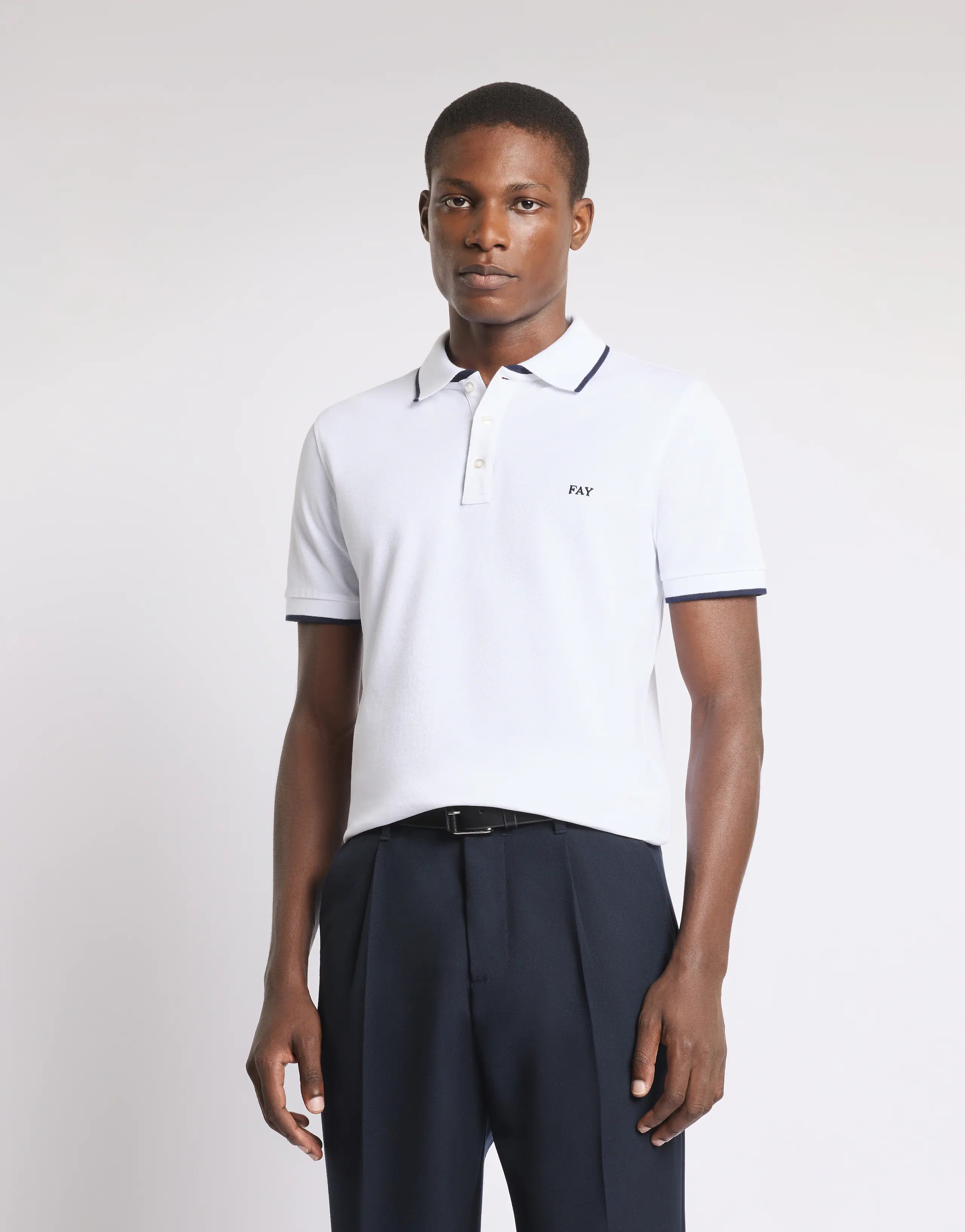 Polo slim fit a manica corta realizzata in piquet stretch, con profili a contrasto. Caratterizzata da un colletto a costine con costruzione double, è arricchita dal logo Fay ricamato sul petto. Fitting: slim