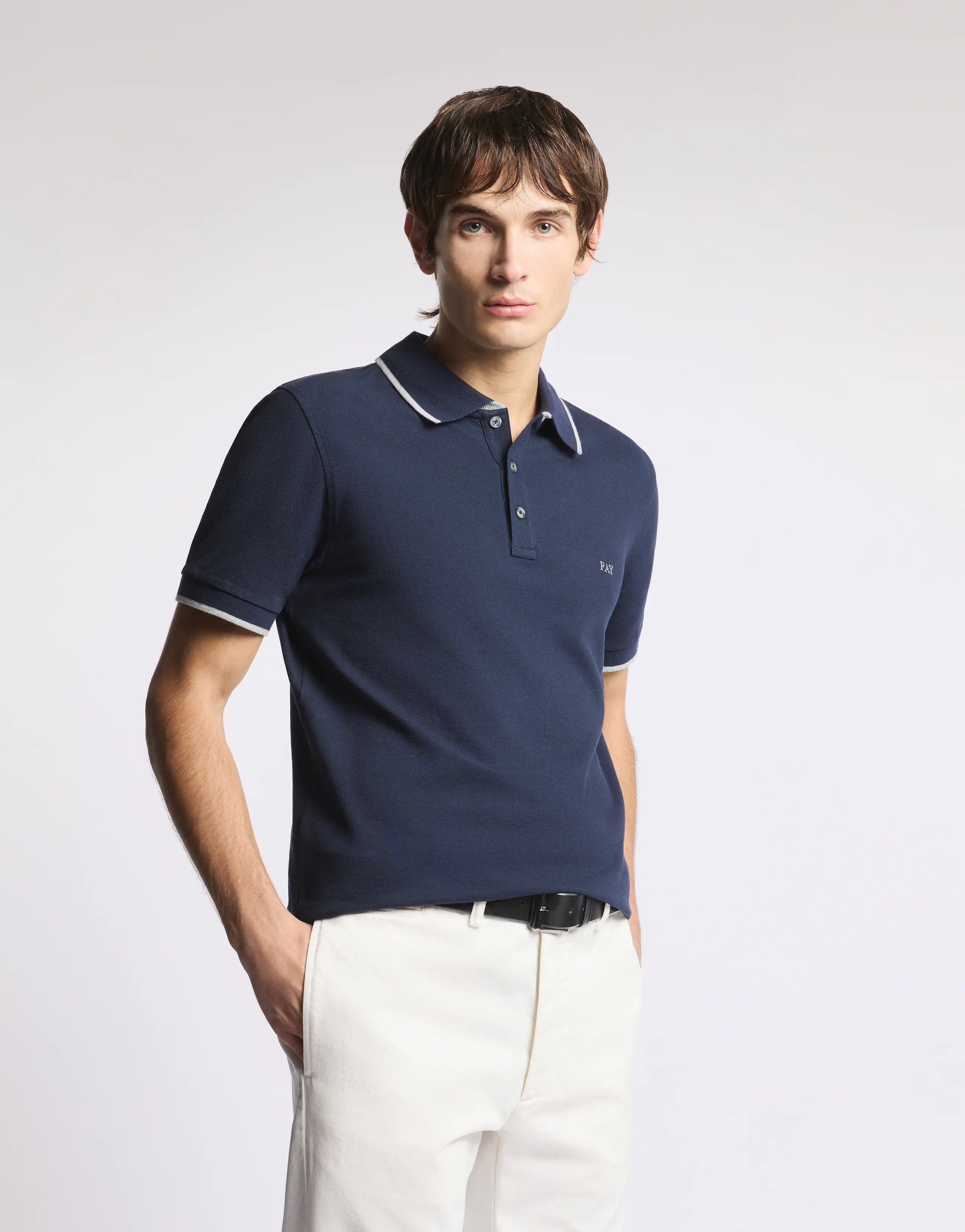 Polo slim fit a manica corta realizzata in piquet stretch, con profili a contrasto. Caratterizzata da un colletto a costine con costruzione double, è arricchita dal logo Fay ricamato sul petto. Fitting: slim