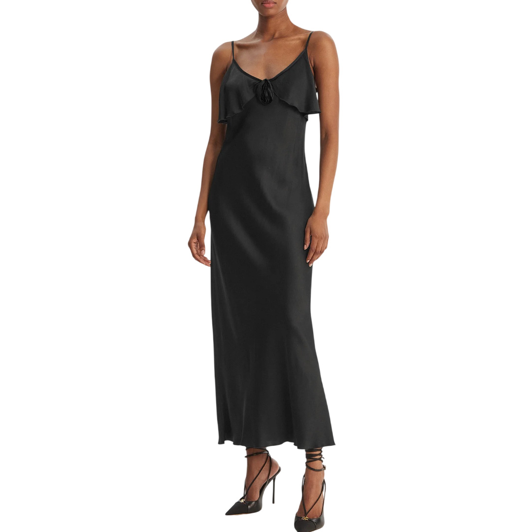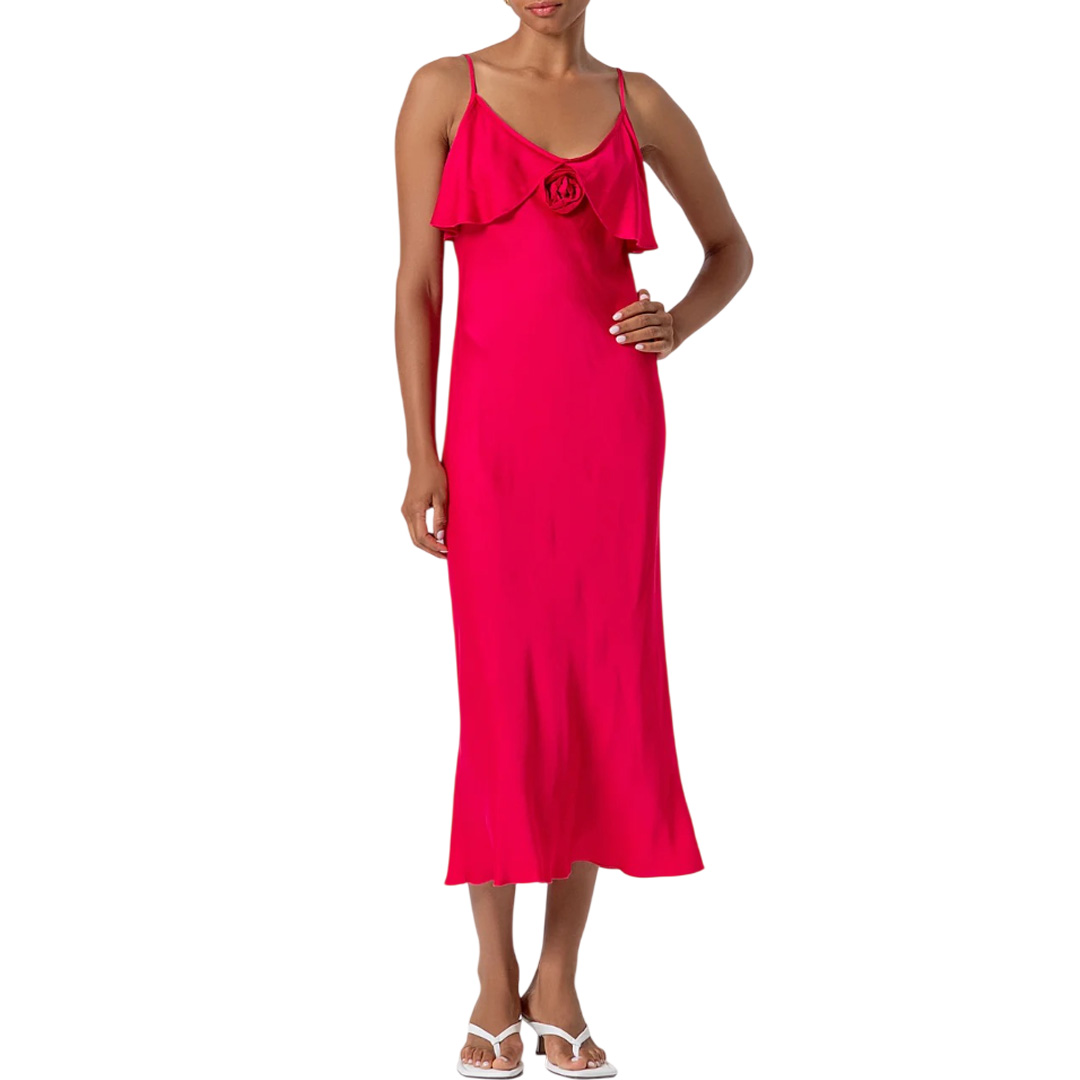 Abito midi senza maniche in raso di viscosa, scollo a V con gale, fiore, bretelline sottili, e con gonna svasata.