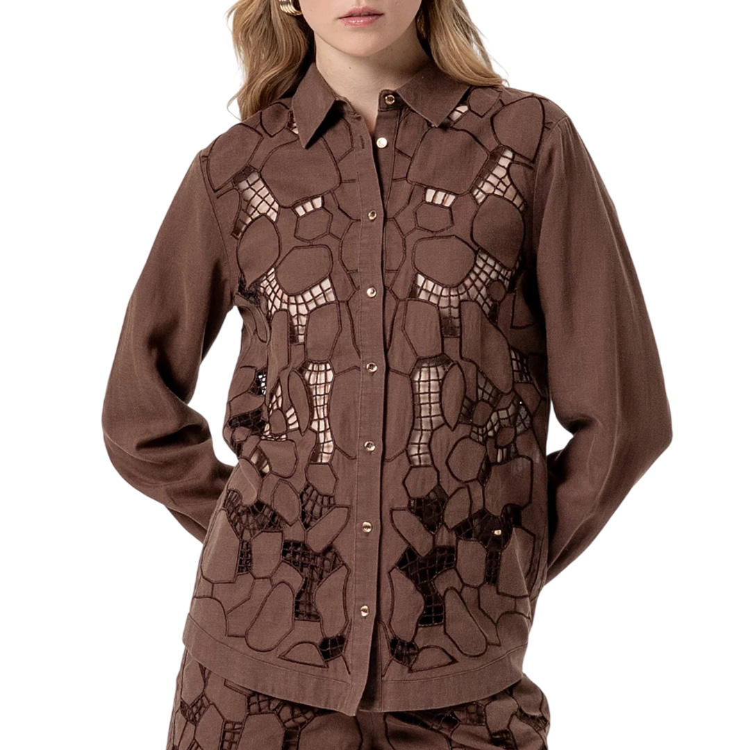 Camicia regular con ricami in tencel e lino, colletto classico, bottoni centrali per apertura, e con maniche lunghe.