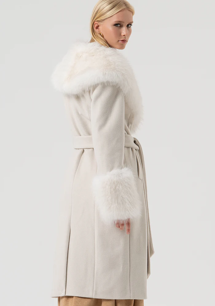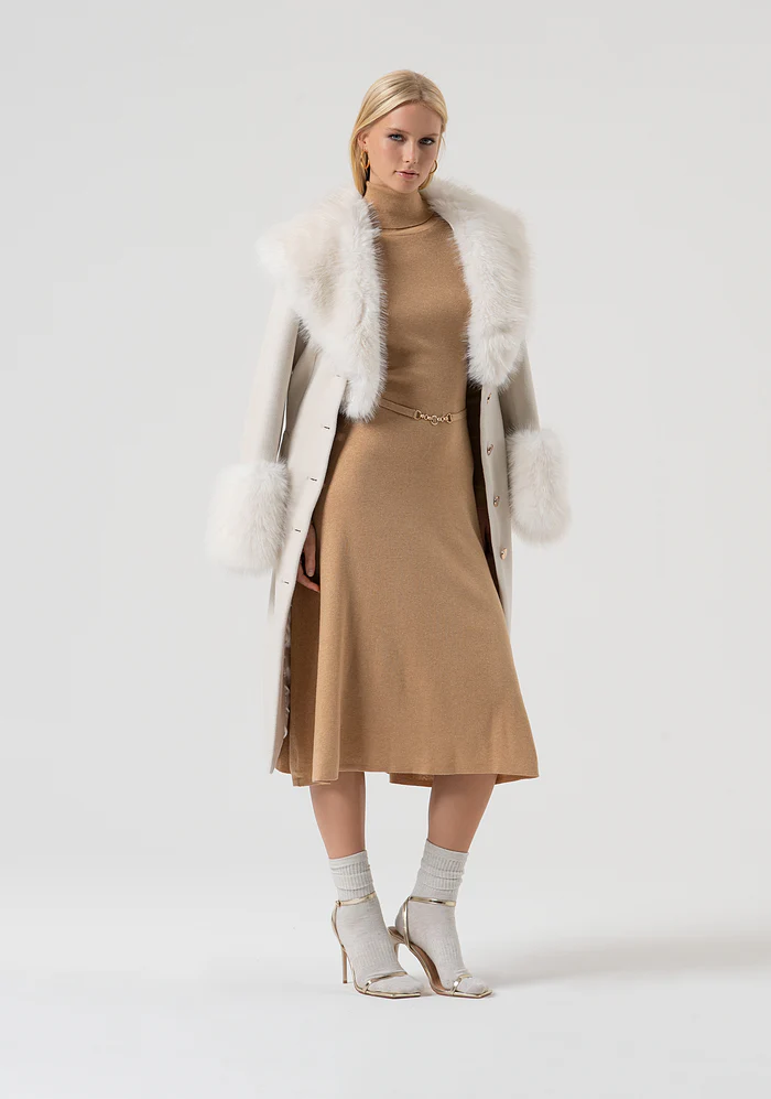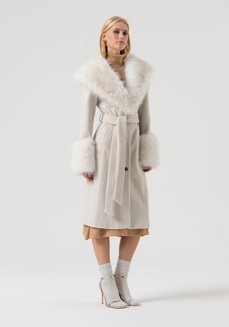 Cappotto regular lungo monopetto, collo ampio e polsi in finta pelliccia, bottoni centrali per apertura, tasche laterali, fusciacca in vita, e con maniche lunghe
